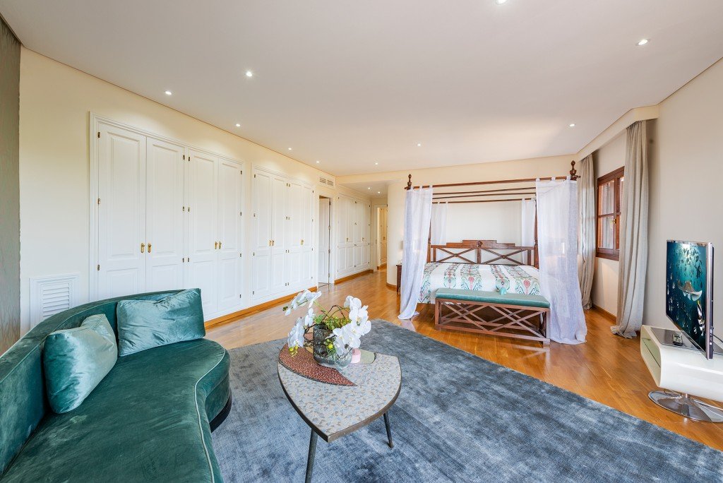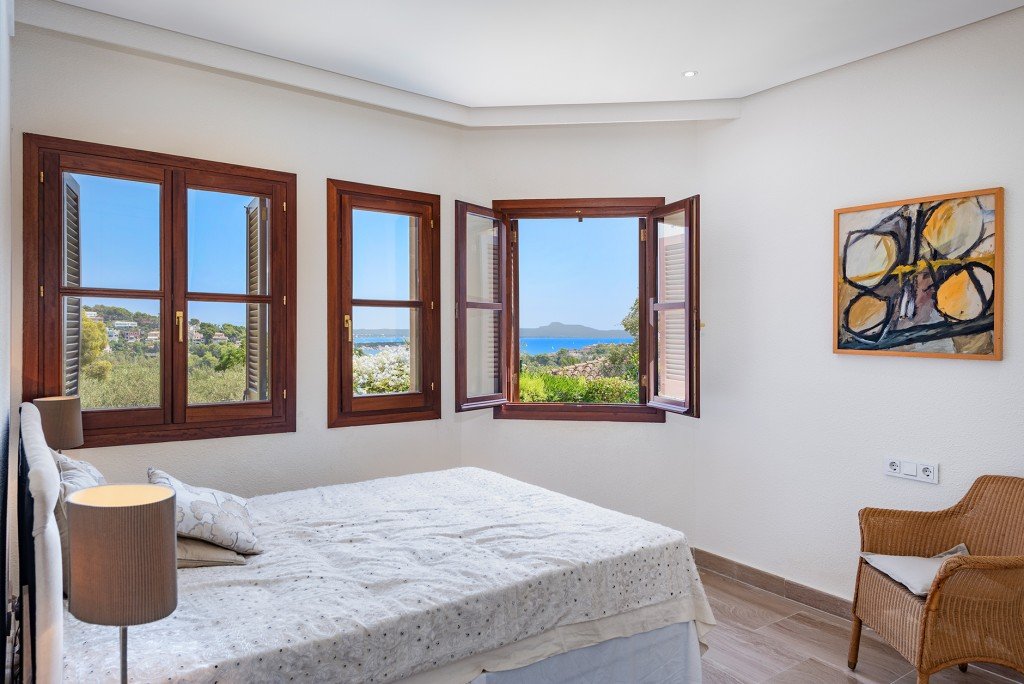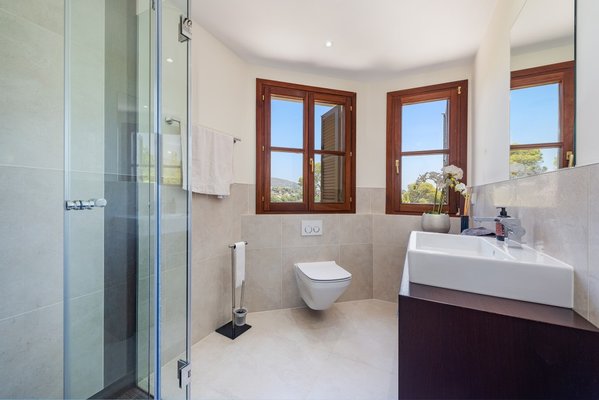 Im Obergeschoss befinden sich drei weitere Schlafzimmer, zwei davon mit en-suite Badezimmern. Die helle und großzügige Master-Suite verfügt ebenfalls über ein eigenes Bad. Alle drei Badezimmer auf dieser Etage sind mit elektrischer Fußbodenheizung ausgestattet. Jedes Schlafzimmer hat direkten Zugang zu einer sonnigen Terrasse mit außergewöhnlichem Blick auf das Meer und die Berge.