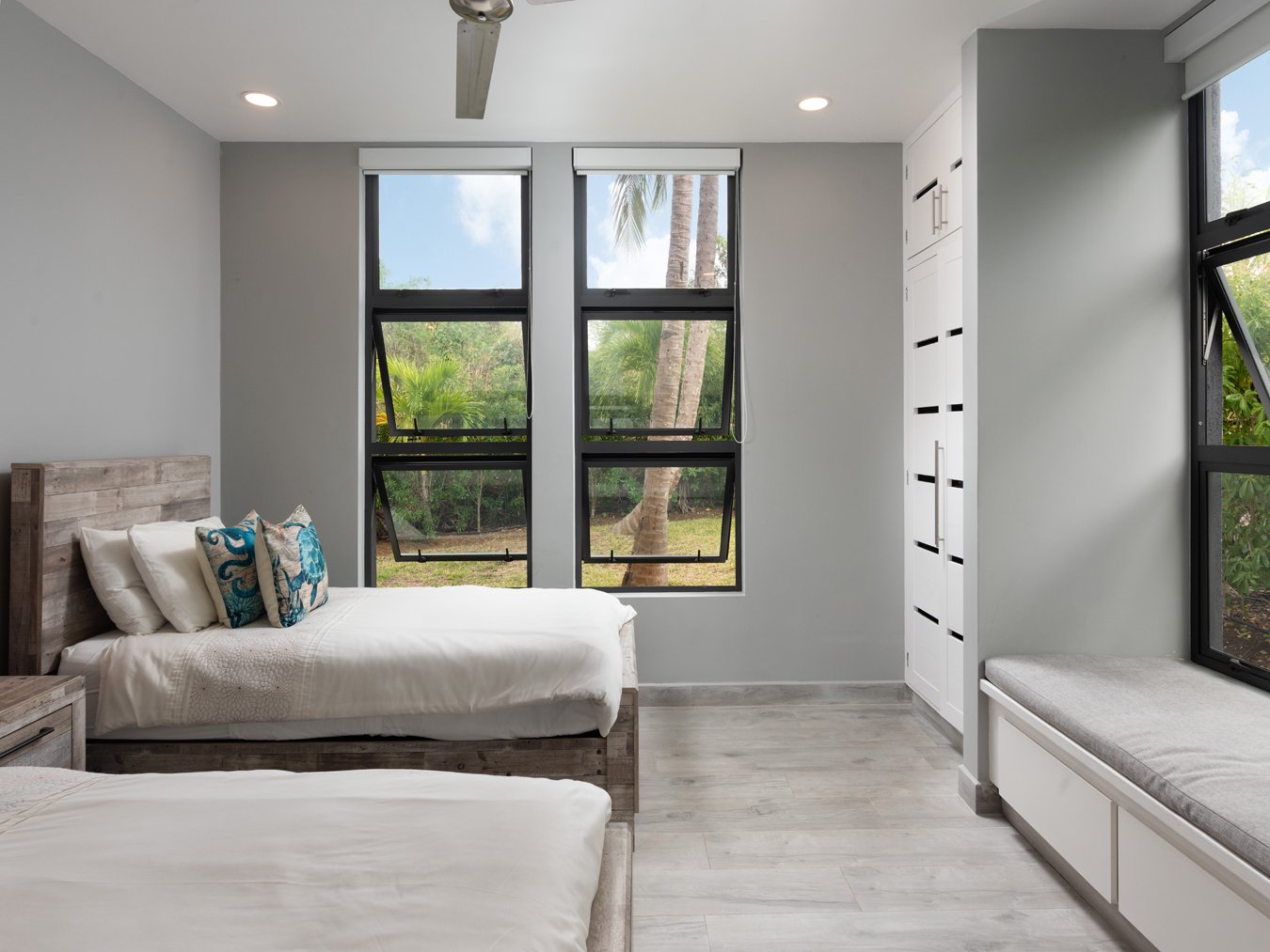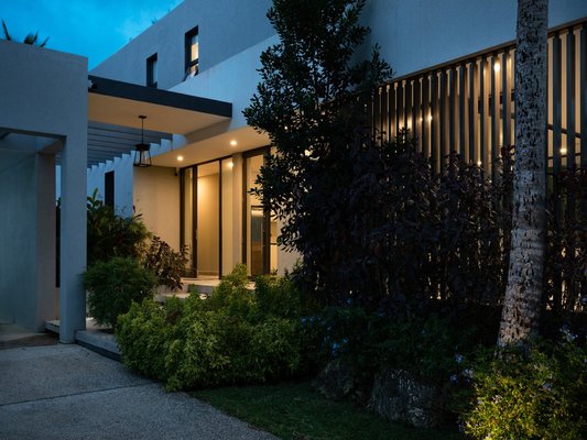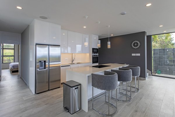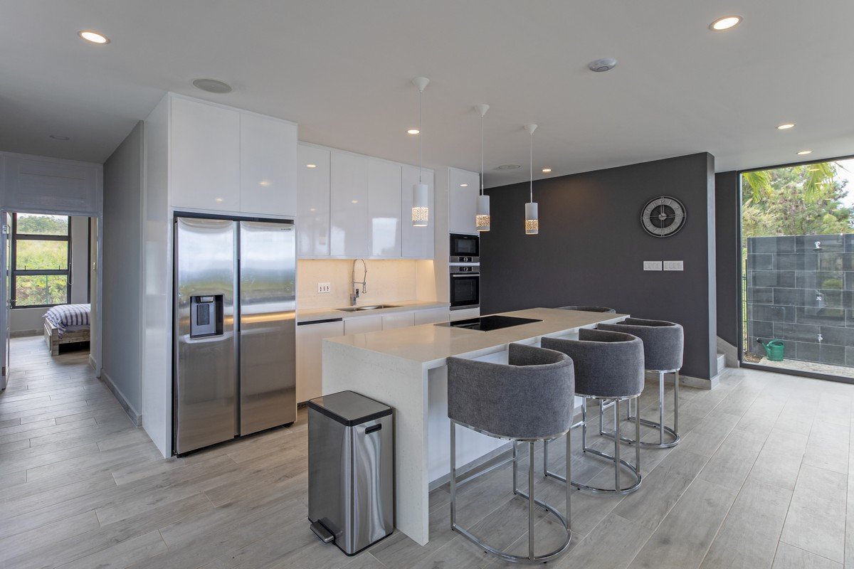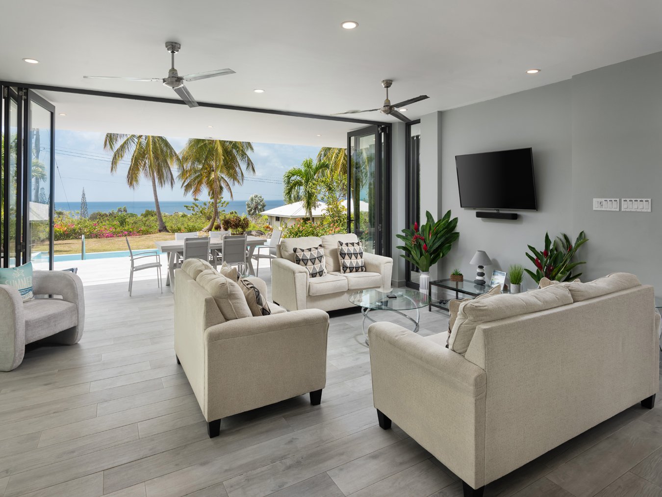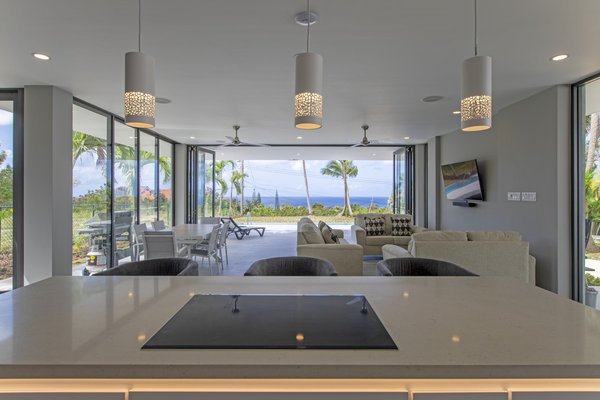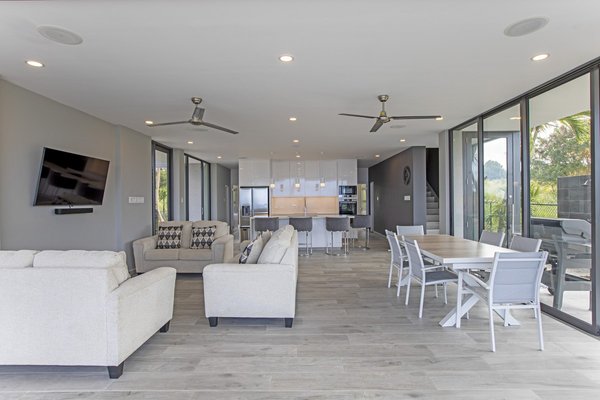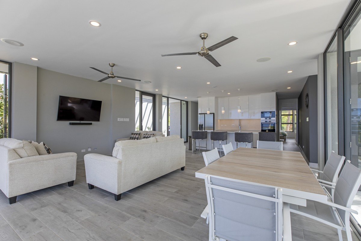 Das Konzept der Villa ist es, ein Außengefühl zu vermitteln und gleichzeitig drinnen zu sein. mit seinen Faltglastüren zum Poolbereich und Glasschiebetüren zur Seite des Grundstücks. Dadurch kann auch eine kühle Brise durchströmen.