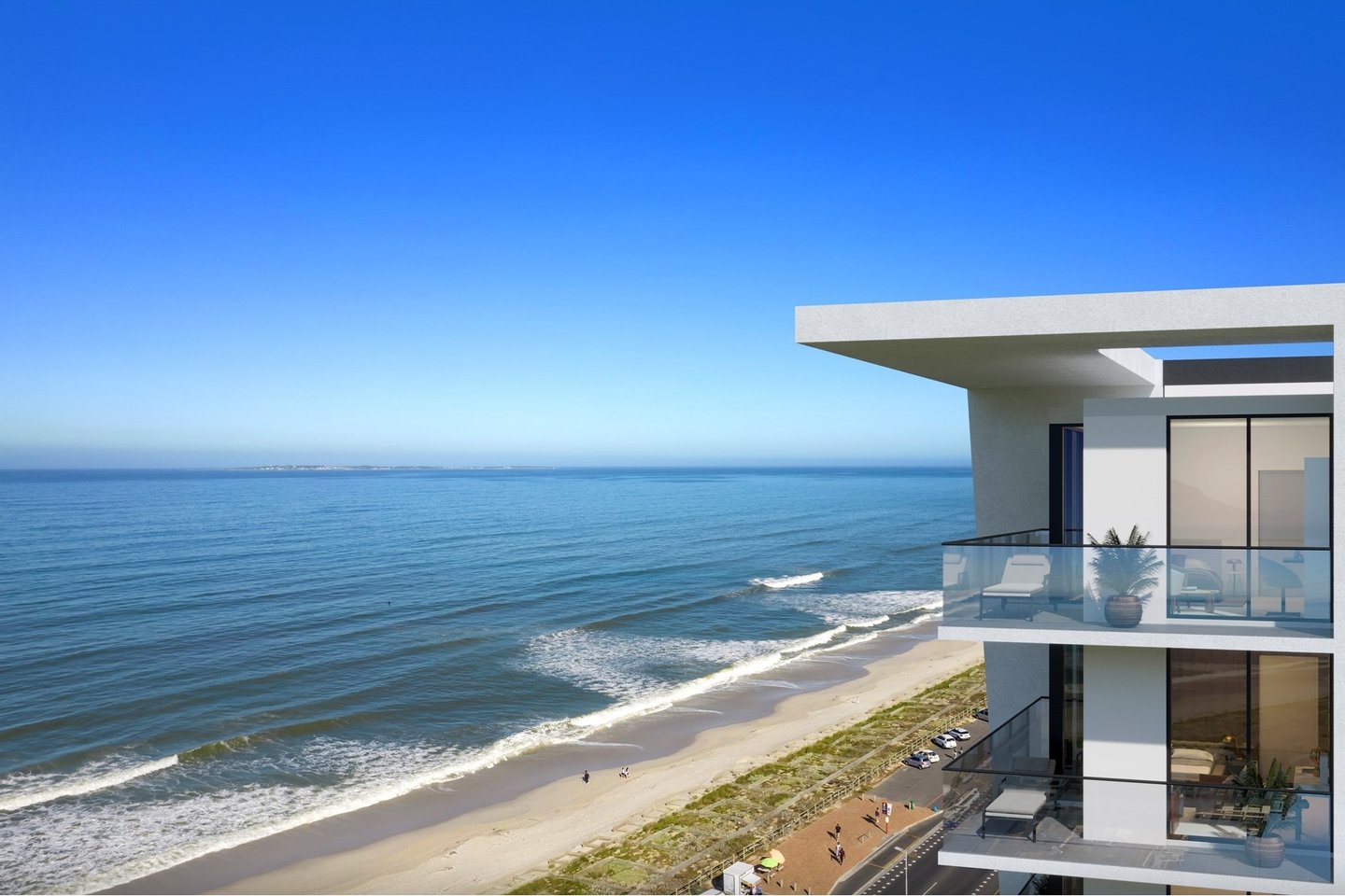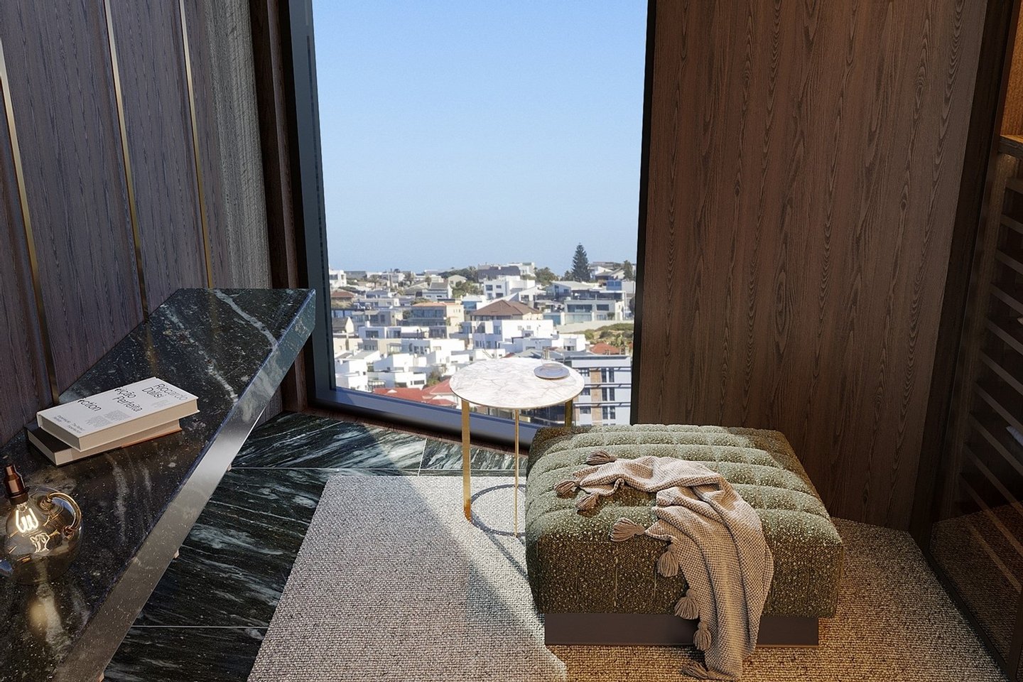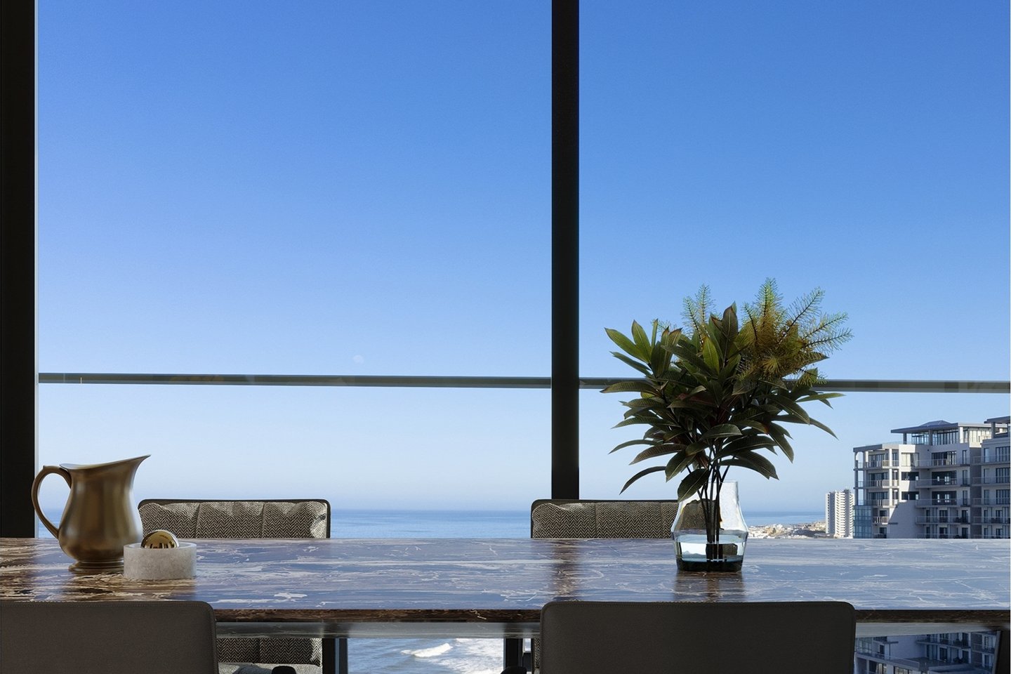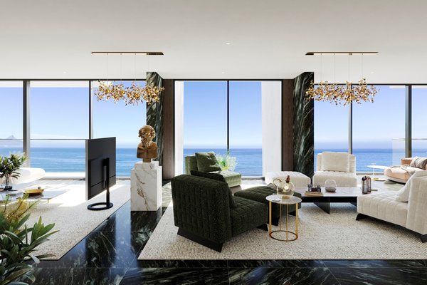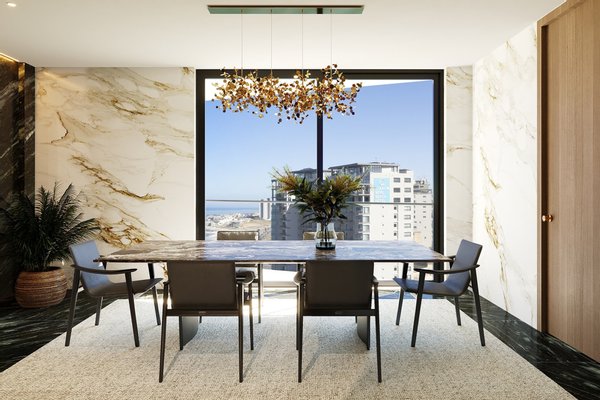 Der umlaufende Balkon bietet nahtloses Wohnen im Innen- und Außenbereich und einen atemberaubenden Panoramablick auf Robben Island, den Tafelberg, den Bloubergstrand Beach und den Blaauwberg Hill, mit atemberaubendem Blick, der sich die Küste hinauf bis zu den Felsenpools von Kleinbaai Beach erstreckt. Entworfen für diejenigen, die die schönen Dinge des Lebens zu schätzen wissen, ist Penthouse F1 perfekt für Unterhaltung und stilvolles Entspannen.