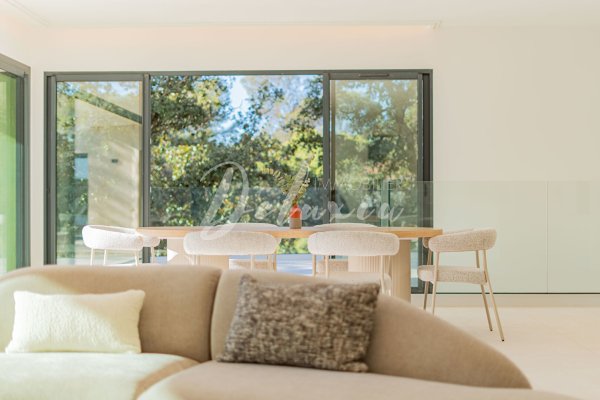 Im Erdgeschoss öffnet sich der Eingang zu einem großzügigen Wohnbereich von 70 m² mit einer offenen Küche und angrenzender Speisekammer, die sich alle zu einer sonnigen Terrasse mit Schwimmbad erstreckt. Diese Ebene umfasst außerdem zwei Schlafzimmer mit eigenem Bad, darunter eine 35 m² große Mastersuite, einen Waschraum, eine Gästetoilette und eine Doppelgarage.