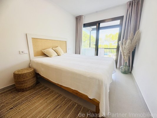 Vom Wohnzimmer gelangen Sie auf den ca. 12 m² großen Balkon, welcher nach Süden ausgerichtet ist. Von hier aus können Sie einen leichten Meerblick genießen.