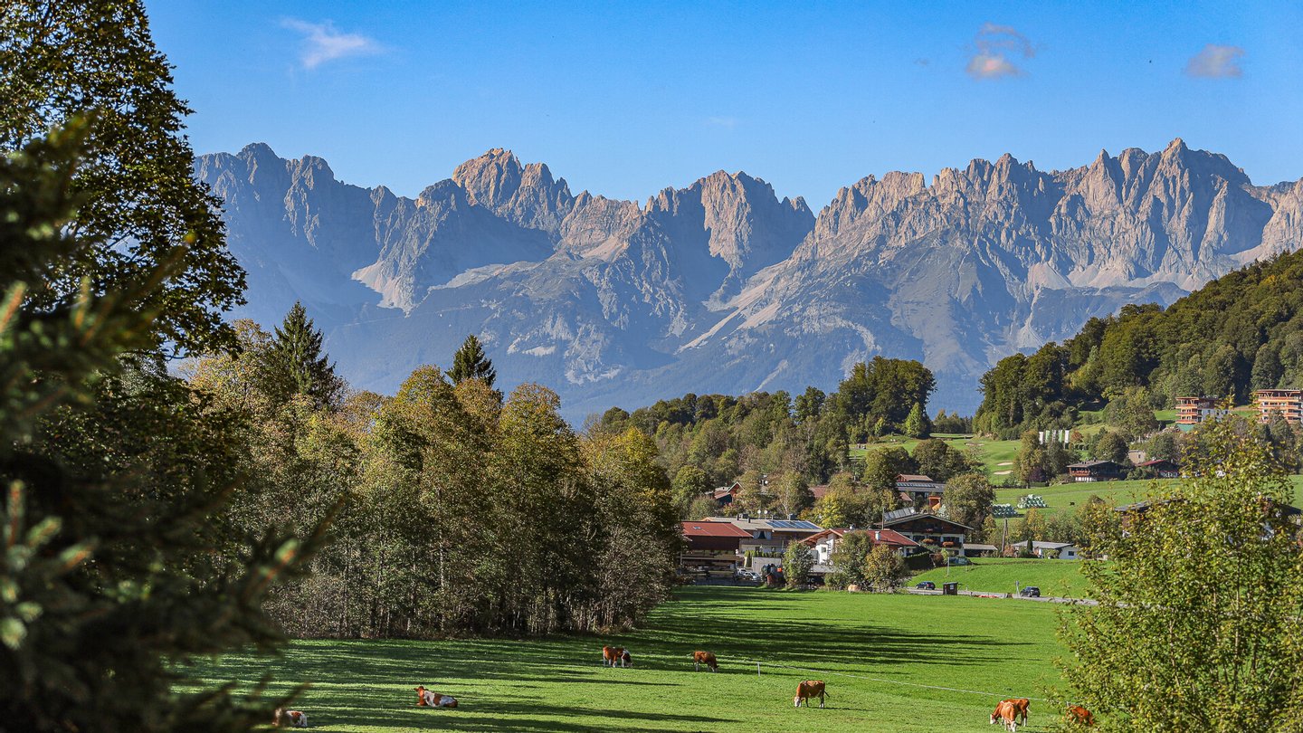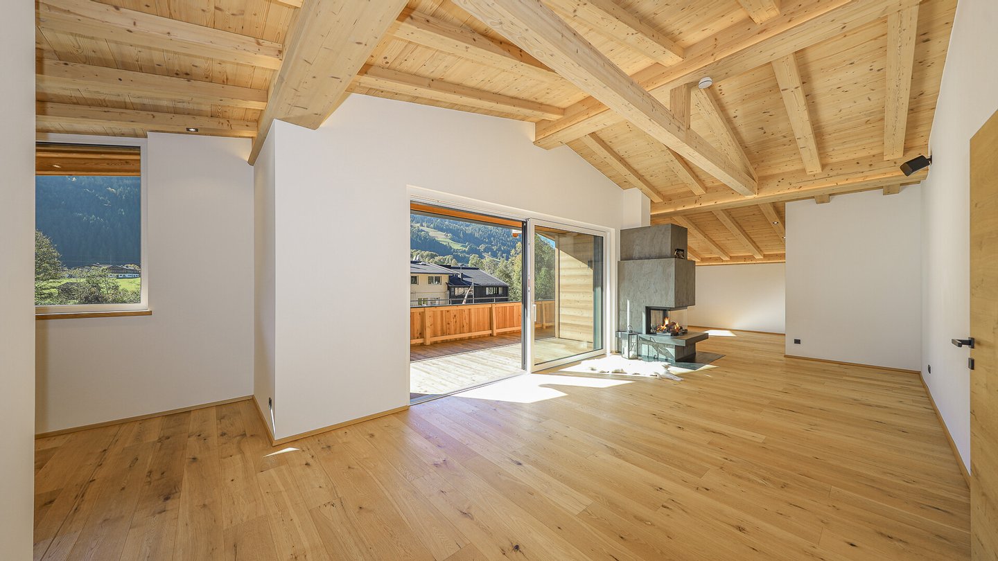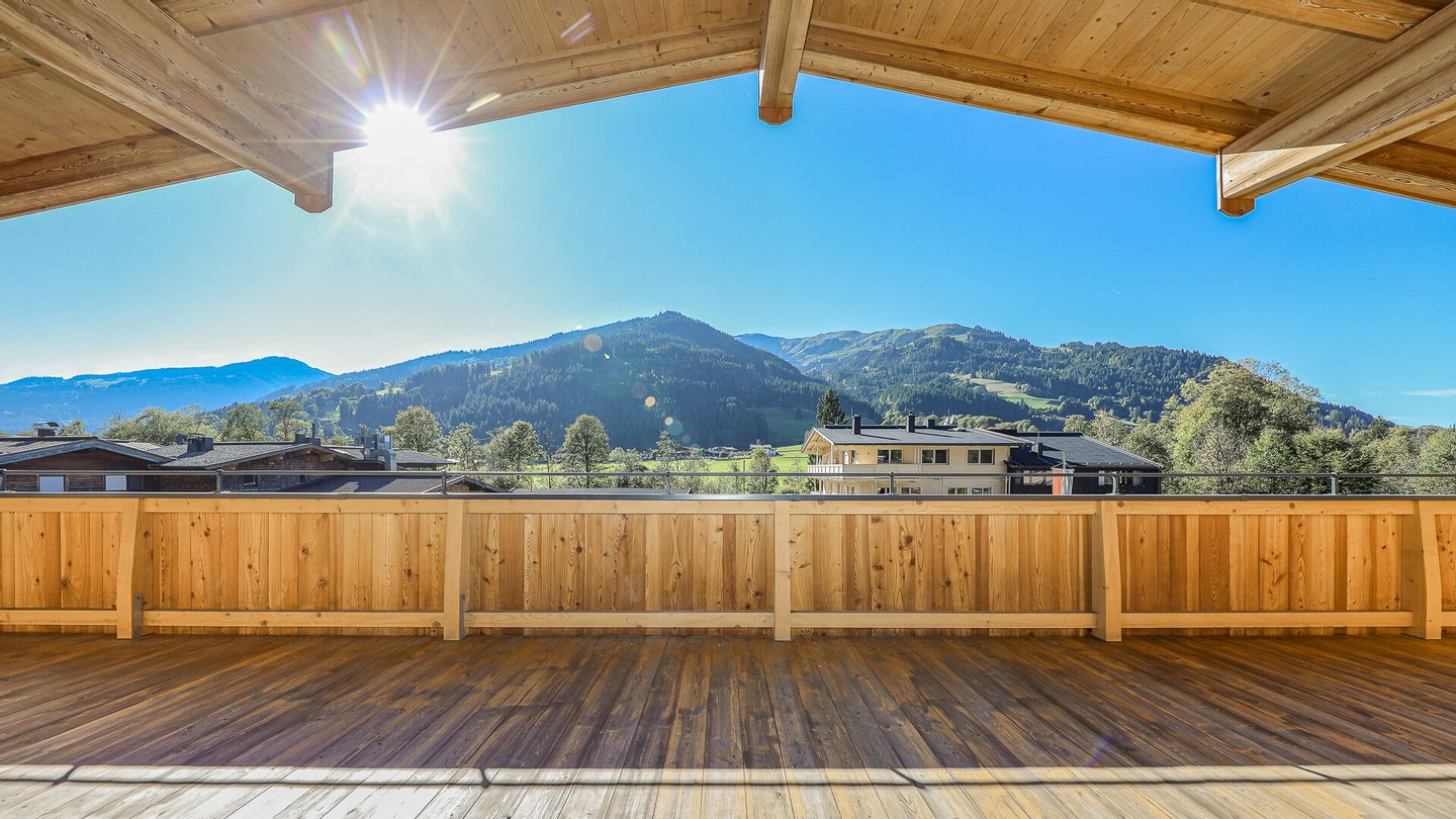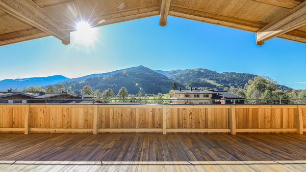 Vom Wohn-Essbereich gelangt man auf eine Richtung Westen ausgerichtete 31 m² große Terrasse, von welcher man einen schönen Ausblick auf die Kitzbüheler Bergwelt bis hin zum Wilden Kaiser genießt.