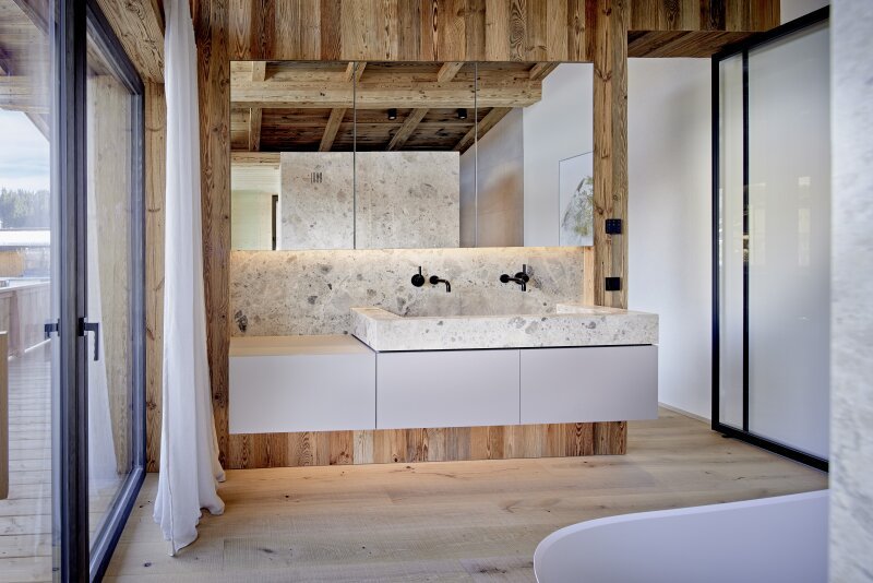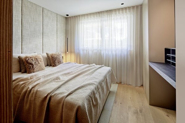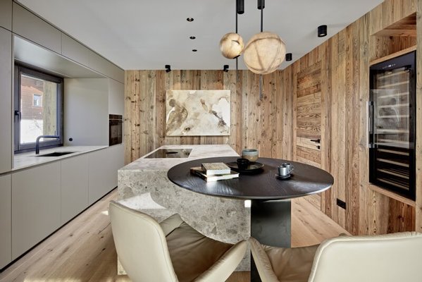 Die Penthouse Maisonette umfasst Teile des Erdgeschosses sowie das gesamte Obergeschoss. Über den Eingangsbereich mit Diele und Garderobe kommt man zu zwei von insgesamt drei Schlafzimmern mit en suite Bädern. Das Herzstück bildet im Obergeschoss der offen angelegte Koch-Ess-Wohnbereich mit offenem Kamin, Sichtdachstuhl aus altem Holz und großen Fensterflächen. Die Küche wurde von Poliform nach Maß gefertigt, bietet im kleinen, angrenzenden Raum die Möglichkeit, diesen als Vorbereitungsküche einzurichten oder als Speis. Auf dieser Ebene sind auch die Master-Schlafsuite mit edlem Badezimmer samt privater Sauna eingerichtet worden und eine Gästetoilette. Flankiert wird diese Ebene an zwei Seiten von breiten Balkonen, die zum Genießen im Freien einladen.