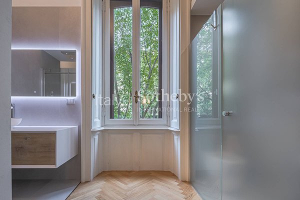 Die Deckenhöhe von 3,65 Metern und die großen bodentiefen Fenster sorgen für viel Tageslicht und ein außergewöhnliches Raumgefühl im Herzen von Mailand. Die Immobilie wurde sorgfältig restauriert, wobei die ursprünglichen Decken erhalten und durch moderne Linien sowie hochwertige Materialien aufgewertet wurden.
