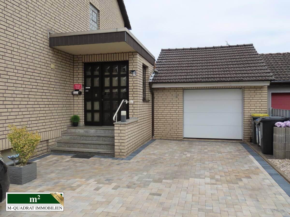Neben einem äußerst gepflegten Vorgarten schließt sich eine akurat gepflasterte Zugangs- und Einfahrtsfläche an. Vor der Doppelgarage mit elektrischem Fronttor, in der zwei Pkw hintereinander eingeparkt werden können, befindet sich eine Stellfläche für bis zu drei weitere Fahrzeuge.