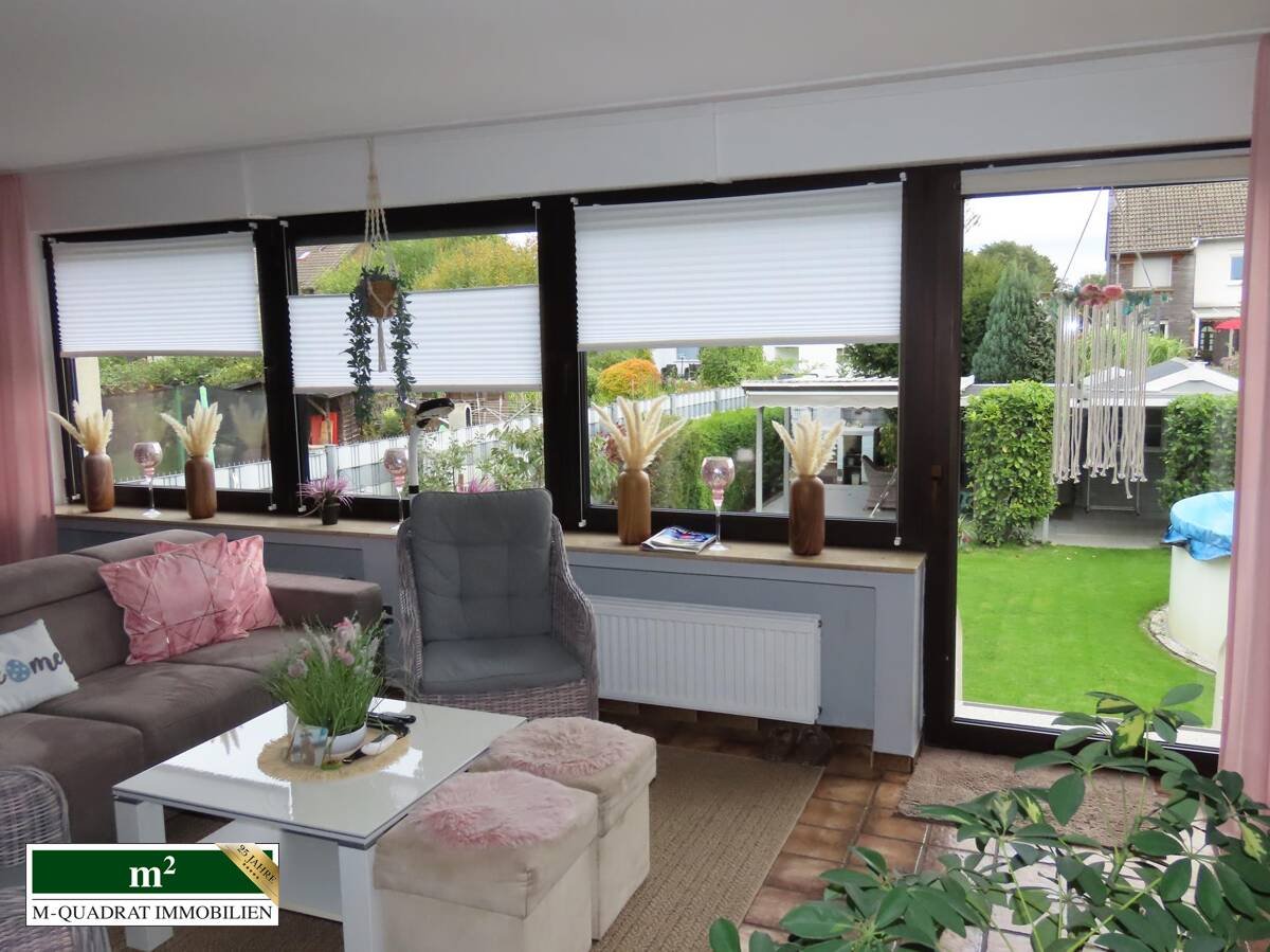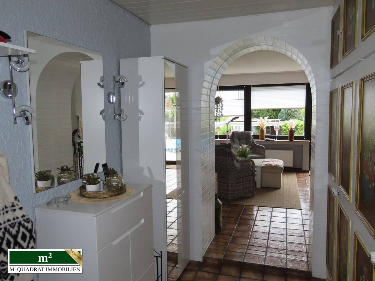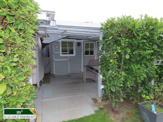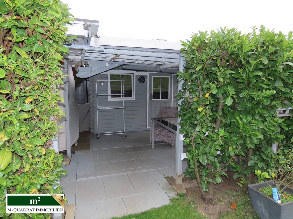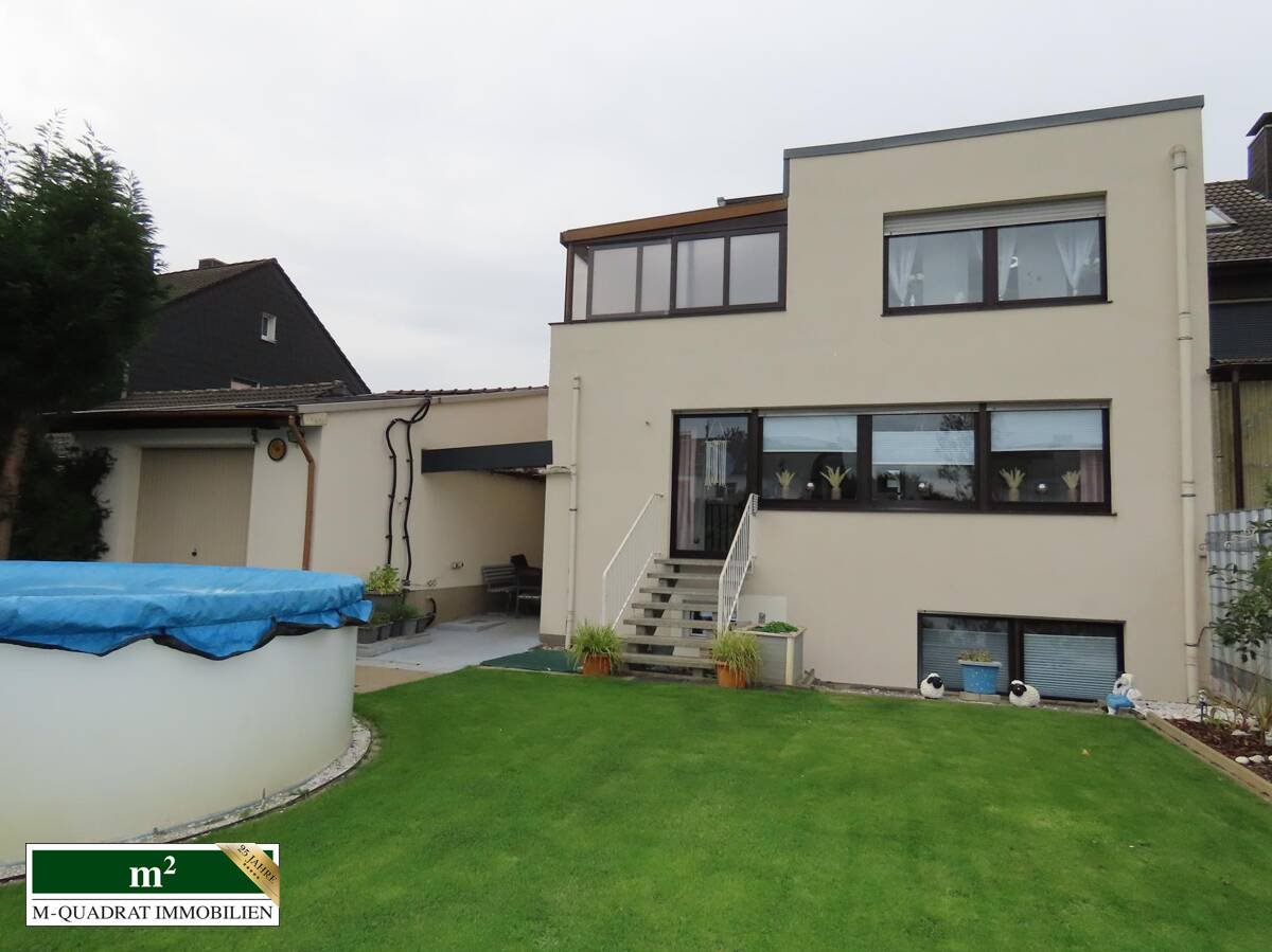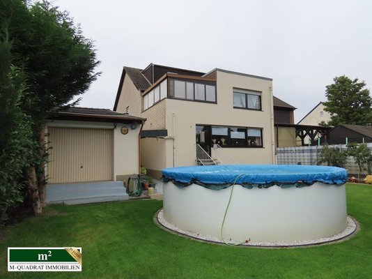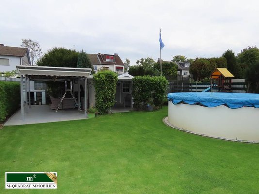 Neben dem Ausgang aus dem Wohnzimmer kann man auch durch den Kellerbereich über eine außenliegende Treppe den äußerst gepflegten Garten erreichen. Hier finden sich neben einer komfortablen Grill-/ Sitzecke, einem Gartenblockhaus, ausreichend Platz für Kinderspielgeräte auch ein Swimmingpool mit einem Fassungsvermögen von etwa 20.000 Litern. Dieser wird mittels einer Sandfilterpumpe gereinigt. Gleichzeitig zirkuliert über ein entsprechendes System vorgeheiztes Wasser, das in einem entsprechenden Behältnis auf dem Dach der Ostseite der Doppelgarage erwärmt wird. Diese (Garage) verfügt im übrigen über ein zur Gartenseite ausgerichtetes zweites Schwenktor, über das bequem Werkzeuge oder andere Utensilien entnommen werden können.