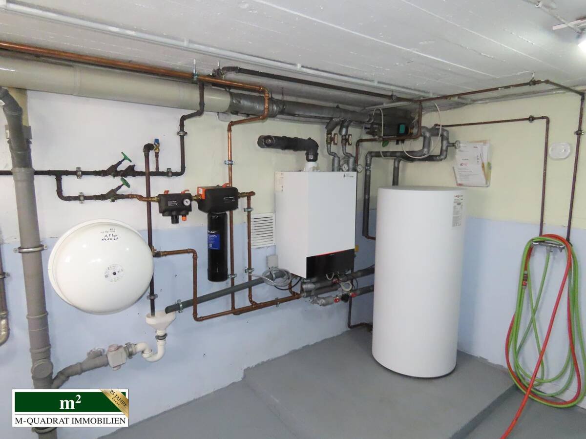 Nun führt der Weg über das Treppenhaus zurück schließlich in den ursprünglichen Kellerteil. Hier befindet sich in einem eigenen Raum die neue Heizanlage. In dem daneben angrenzende Raum sind die Waschmaschinen untergebracht. Wiederum hiervon zweigen zwei getrennt voneinander gehaltene Räume für Abstellzwecke ab. Der ursprüngliche Kellerteil und der des Anbaus sind durch eine gegenwärtig verschlossene Tür miteinander verbunden. Diese könnte jederzeit wieder geöffnet werden.