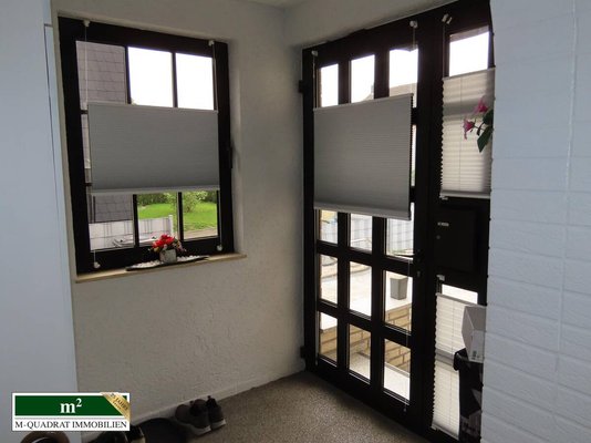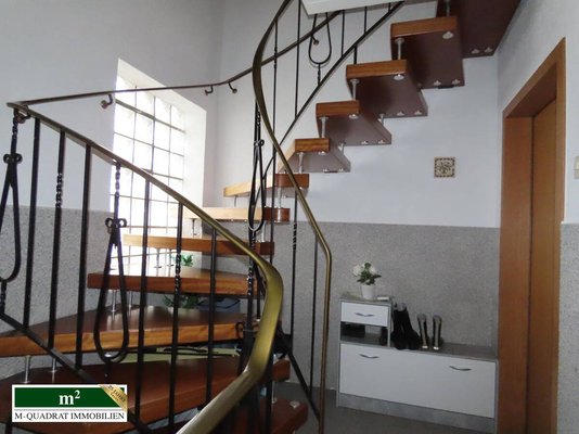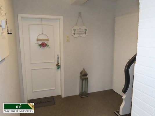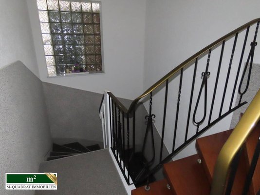 Man betritt das Haus über eine vierstufige Treppe. Hinter der Hauseingangstür liegt ein Windfang, in den eine Garderobe integriert ist. Daran schließt sich das in Steinteppich gehaltene Treppenhaus an, von dem aus jede Wohnung, als auch der zur Straßenseite gelegene Kellerteil begangen werden kann.