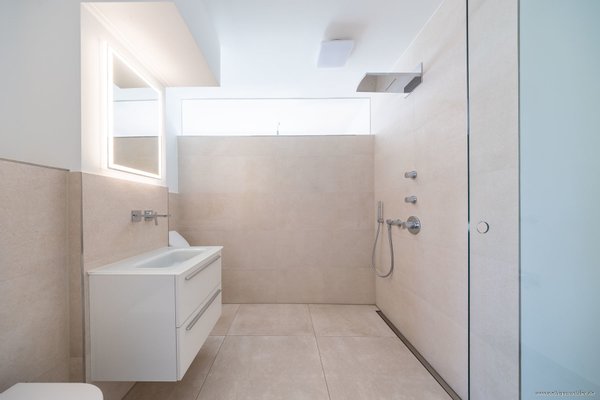 Über einen Flur mit perfekt platzierten Einbauschränken kommen Sie linkerhand in das hochwertig ausgestattete Gästebadezimmer mit bodengleicher Regendusche und hochwertigen Armaturen. Durch einen modernen, beleuchteten Spiegel sowie raumbreite Oberlichter wird der Raum durchwegs erhellt. Die Anschlüsse für eine Waschmaschine sowie einen Trockner sind ebenfalls platzsparend in diesem Bereich integriert.