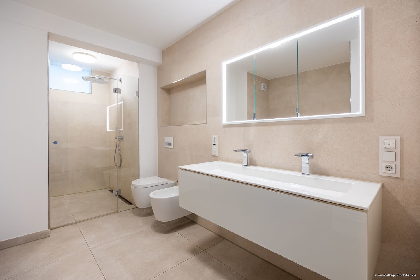 Das hochwertige Masterbadezimmer überzeugt mit einem stimmigen Gestaltungskonzept aus eleganten Keramikfliesen in warmen Erdtönen und stilvollen, weißen Akzenten. Über dem edlen Doppelwaschtisch befindet sich ein beleuchteter Spiegel, während in die Wand eingelassene Nischen praktische Ablageflächen für Kosmetik und Dekoration bieten. Die bodentiefe Regendusche mit Glasabtrennung fügt sich nahtlos ins Gesamtbild ein. Ergänzt wird das exklusive Ambiente durch ein zusätzliches Bidet, eine großzügige Badewanne mit Handbrause sowie einen Handtuchheizkörper.