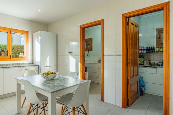 Die großzügige Einbauküche mit Gasherd verfügt über einen Hauswirtschaftsraum mit angrenzender Terrasse und eine praktische Speisekammer.