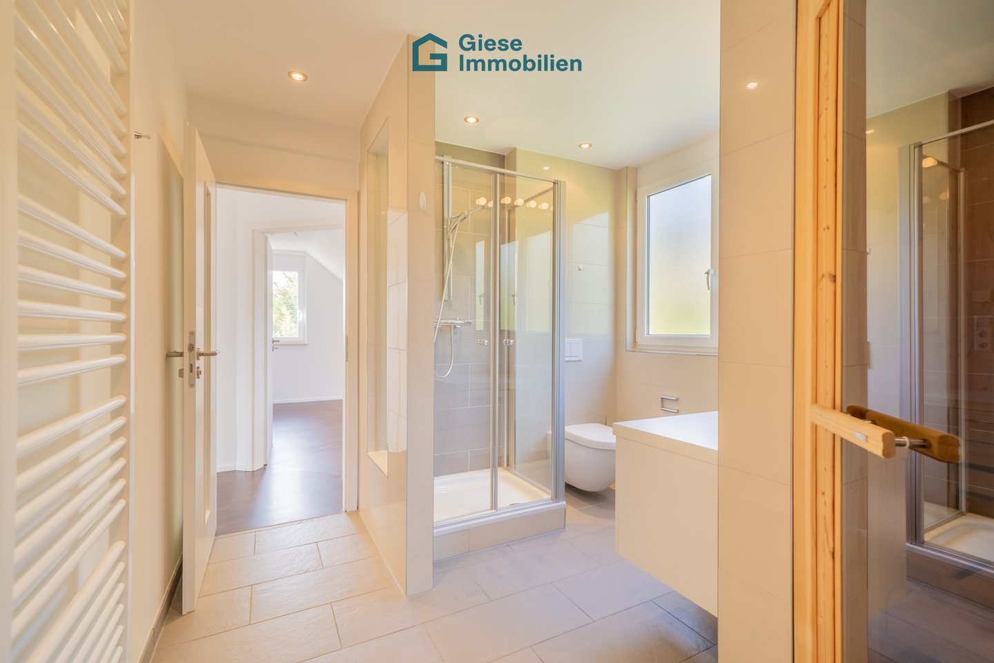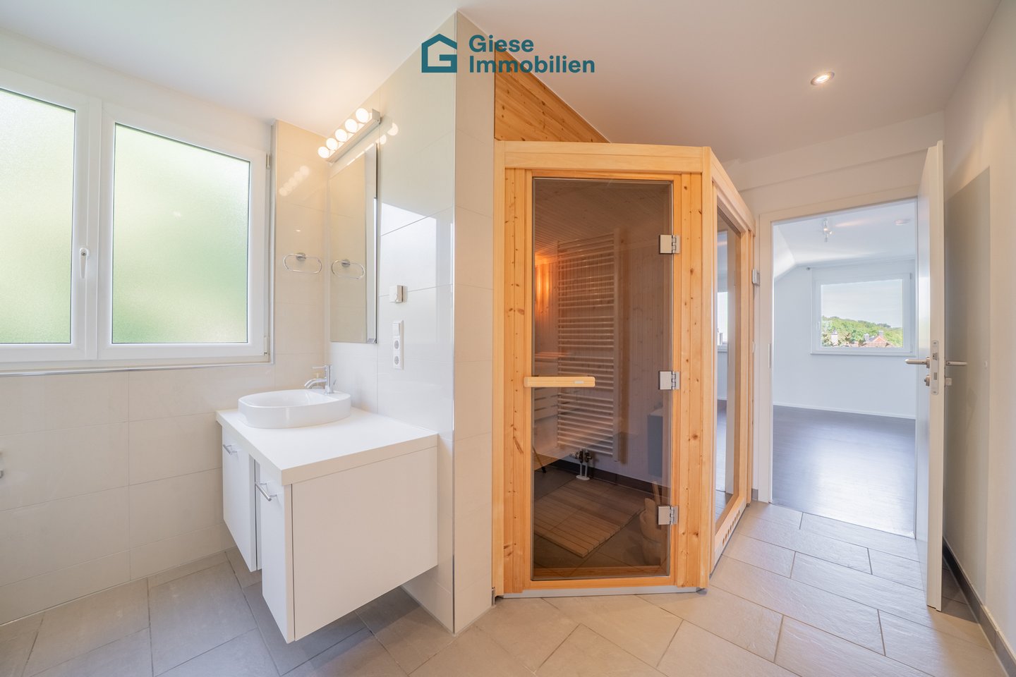 Darüber hinaus bietet diese Ebene drei weitere Zimmer, die durch ihre Größe und Helligkeit überzeugen. Ob als Kinderzimmer, Gästezimmer oder Homeoffice – sie lassen sich flexibel und individuell gestalten. Den Ausgleich zum Alltag schafft die private Sauna: ein exklusiver Rückzugsort, der Ruhe und Erholung in die eigenen vier Wände bringt. Ergänzt wird das Ensemble durch ein edles Badezimmer, das die Ausstattung dieser Etage abrundet.