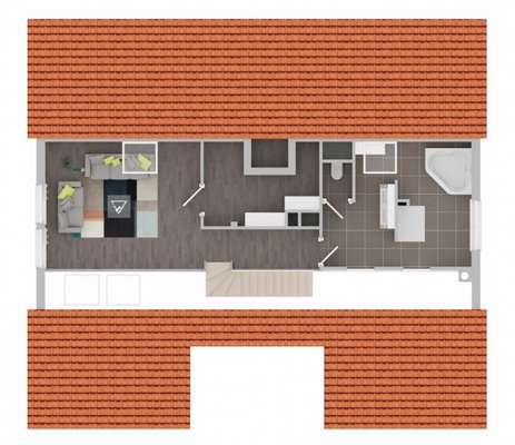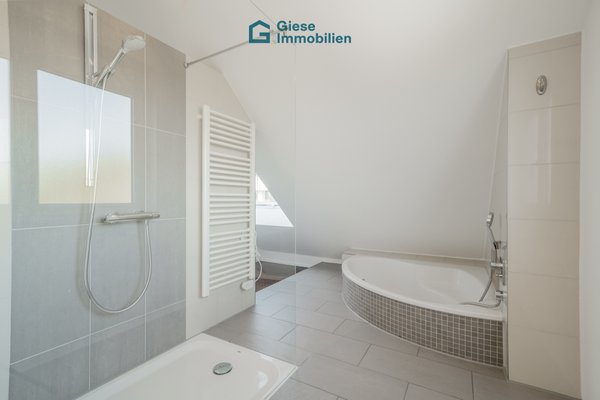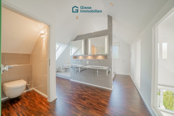 Die obere Ebene bietet einen privaten Rückzugsbereich, der Großzügigkeit und Ruhe vereint. Das Schlafzimmer beeindruckt durch seine offene Raumwirkung und die natürliche Helligkeit, die durch die großen Fenster entsteht. Direkt anschließend sorgt eine begehbare Ankleide für luxuriösen Komfort im Alltag. Das Badezimmer dieser Etage überzeugt mit einer klaren Gestaltung und edlem Ambiente, das den hochwertigen Charakter der Wohnung stimmungsvoll vollendet.
