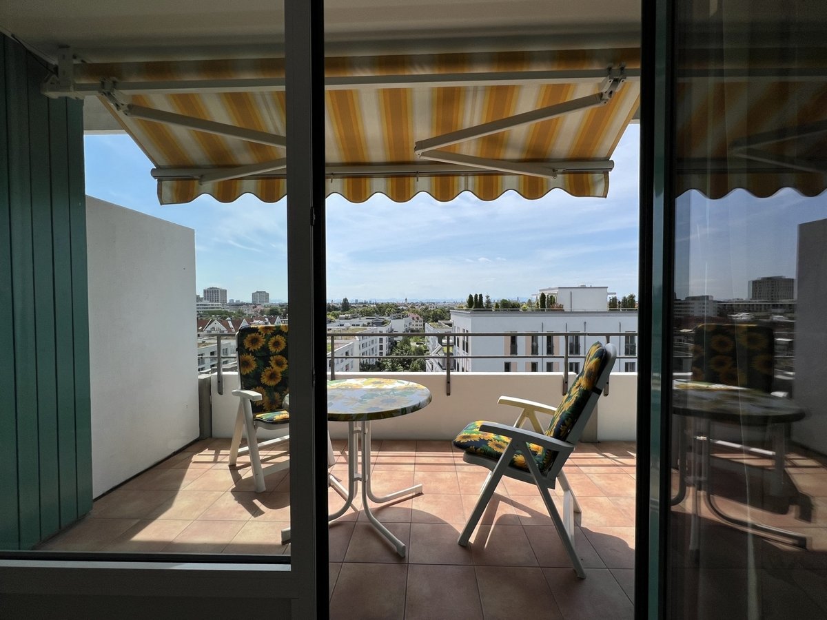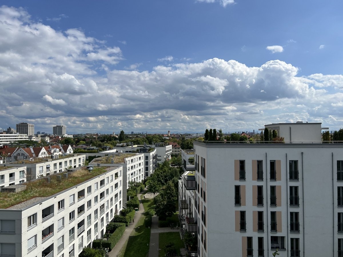 Diese großzügige und gut geschnittene 2-Zimmerwohnung befindet sich im obersten Stockwerk einer sehr gepflegten Wohnanlage in Nordschwabing. Die Wohnung liegt zwischen der Leopoldstraße und der Belgradstraße nördlich des Schwabinger Krankenhauses. Die Wohnung befindet sich im 8. Stockwerk und ist nach Süden und Westen ausgerichtet. Die großflächig verglasten Fensterelemente der Süd- und Westfassade sorgen für eine gute Belichtung. Die Wohnung ist sehr hell und freundlich und hat im Süden eine durchgehende Loggia, die im Bereich des Schlafzimmers zurückspringt und somit Platz für einen Tisch und Stühle bietet. Durch die Lage im obersten Stockwerk hat man einen herrlichen Blick über München und sieht bei klarem Wetter das Alpenpanorama im Hintergrund.