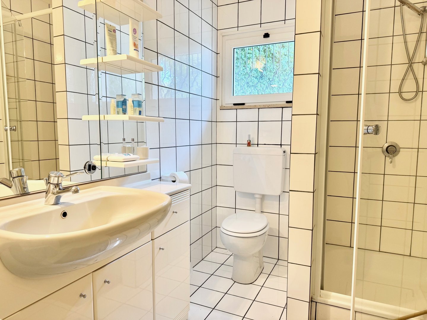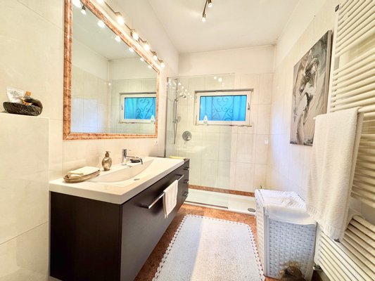 Die Villa bietet eine Wohnnutzfläche von ca. 162 qm ist wie folgt aufgeteilt: EG: heller Wohn/-Esszimmer mit Ausgang auf die große, teilweise überdachte „L-förmige“ Terrasse, separate Küche, 1 Schlafzimmer, Arbeitszimmer und ein Badezimmer mit Dusche. Gartengeschoss (intern verbunden, aber auch mit separatem Zugang): Ein Schlafzimmer, ein Badezimmer, Abstellraum und Keller. Das Grundstück hat eine Größe von ca. 1.340 qm. Der schöne Außenbereich mit mehreren Terrassen und einem überdachten Autoabstellplatz runden dieses Angebot ab.