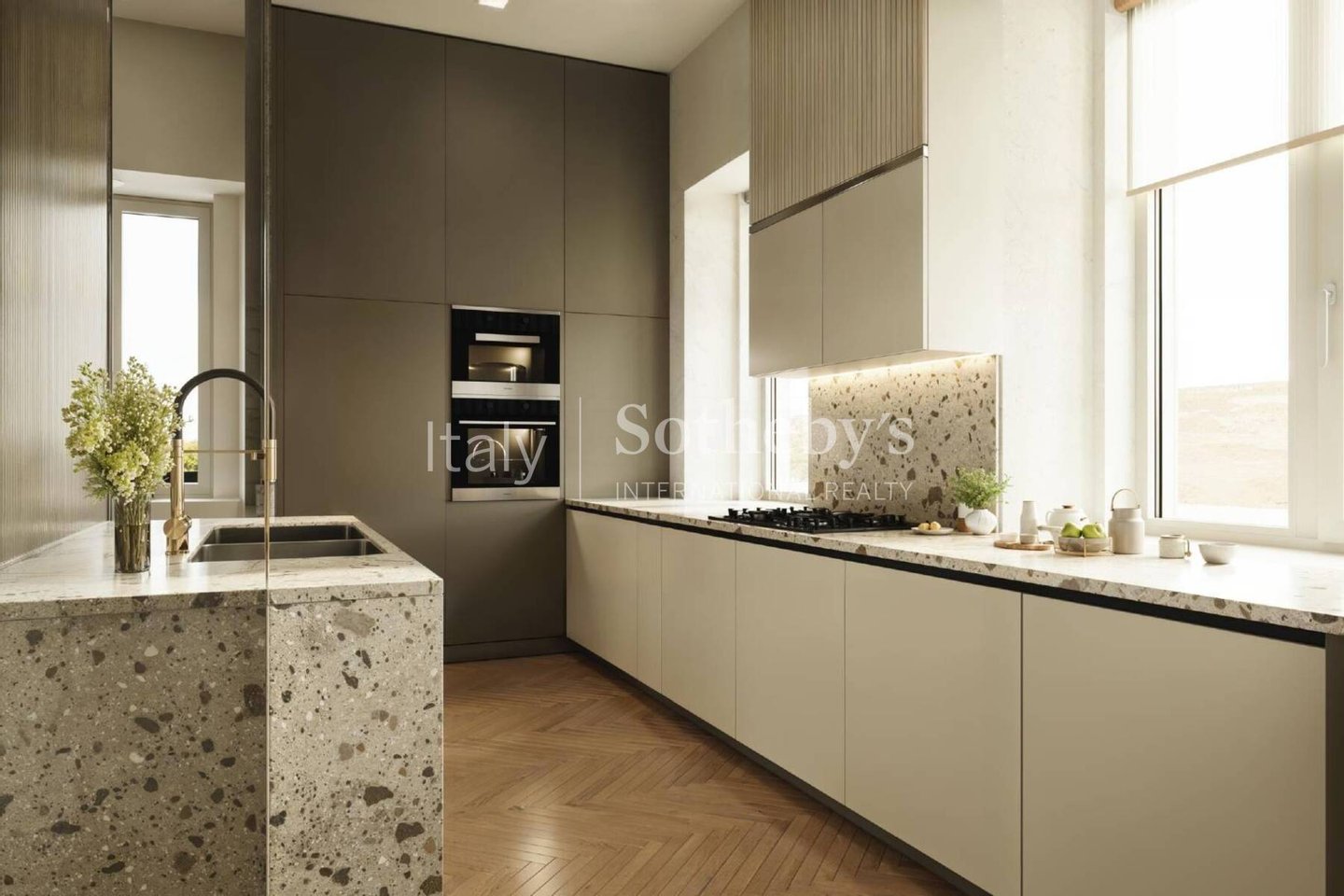 Die Wohnung, die über einen Aufzug erreichbar ist, wird vollständig renoviert übergeben, mit hochwertigen Materialien und Ausstattungen, die den historischen Charme der Villa mit zeitgenössischem Design und moderner Technik verbinden.