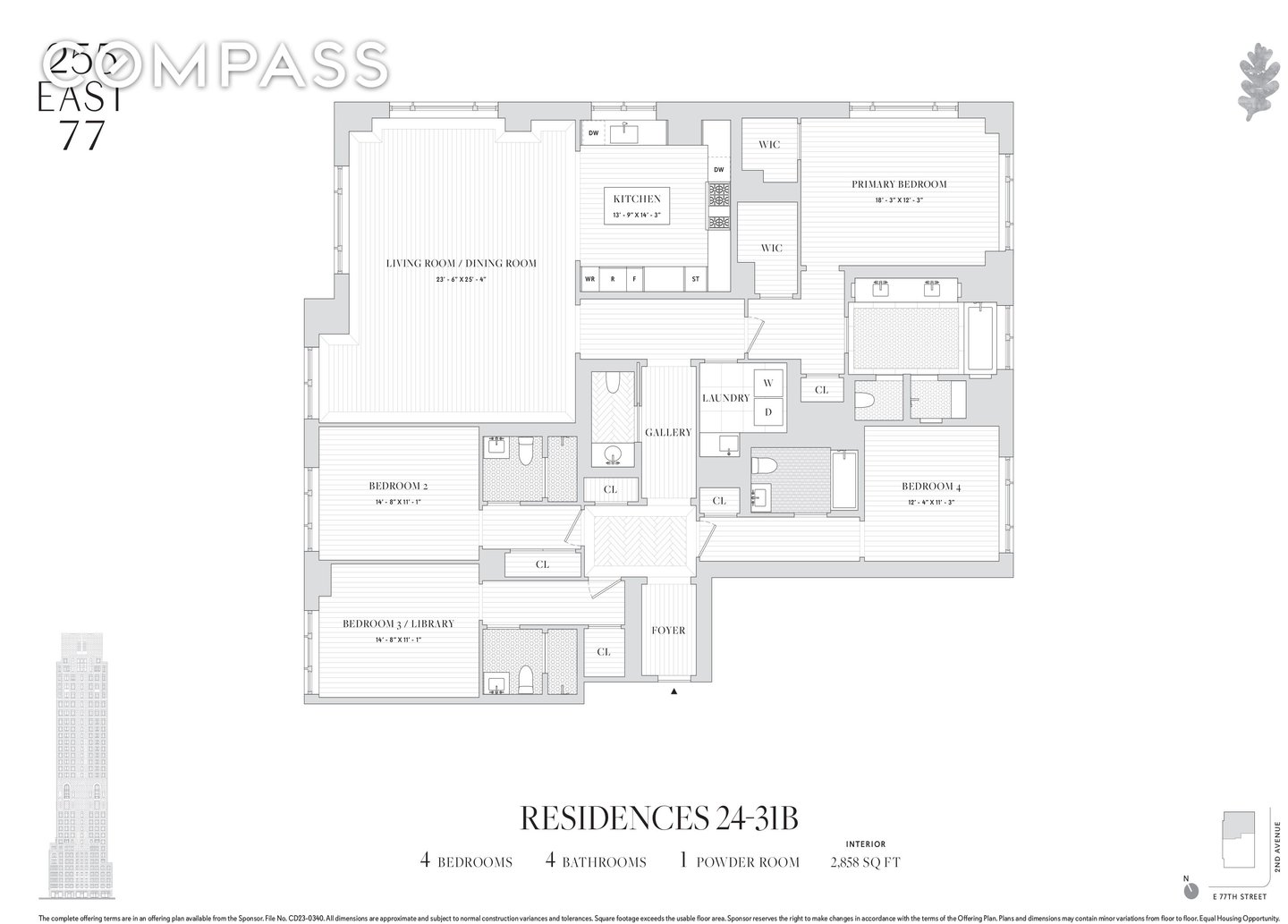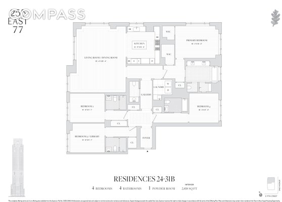 27B ist eines unserer charakteristischen Turmhäuser. Mit einem atemberaubenden offenen Blick auf drei Seiten, Norden, Osten und Westen, ist diese Residenz mit vier Schlafzimmern und viereinhalb Bädern perfekt. Eine Galerie mit tollen Kunstwänden führt in ein großes, fast quadratisches, Eckwohnzimmer. Eine große, offene Küche ist etwas versteckt, um eine formellere Dinnerparty zu ermöglichen, ist aber offen für das ganze Licht und den Blick auf den großen Raum und hat auch ein eigenes großes Fenster über dem Waschbecken. Die vier Schlafzimmer, jedes mit eigenem Bad und großzügigem Schrankraum, sind geflügelt, was eine große Flexibilität ermöglicht. Ein Schlafzimmer ist mit dem Wohnzimmer ausgerichtet, so dass es eine Bibliothek sein kann. Die Hauptsuite befindet sich sehr privat an der nordöstlichen Ecke und verfügt über zwei große begehbare Kleiderschränke und ein Bad mit fünf Armaturen. Eine charmante Gästetoilette und eine voll ausgestattete Waschküche mit Waschbecken vervollständigen das Haus. Das Design der Residenzen in 255 East 77 ist zeitgemäß und ehrt den Klassizismus mit einem frischen Ansatz. Viel Licht strömt herein und ergänzt die maßgeschneiderten Innenräume, die mit makellosen weißen Eichenböden verankert sind. Das Engagement für exzellentes Design ist in jedem Raum und bei jeder Gelegenheit zu spüren, insbesondere in den Küchen, die mit geschliffenen Arbeitsplatten und Rückwänden aus Calacatta-Marmor ausgestattet sind und modernste Technologie, Spitzengeräte (Miele und Sub-Zero) und schöne Handwerkskunst vereinen. Die Hauptbadezimmer verfügen über maßgefertigte Steinböden, Wände aus Bianco-Dolomit-Marmor und Waschtischplatten, die durch warme Holzschränke und Waterworks-Hardware ergänzt werden. Regenduschen und Fußbodenheizung verleihen jedem Tag Luxus. 255 East 77th Street ist ein wunderschöner Wohnturm, der von der Naftali Group entwickelt und von Robert A.M. Stern Architects entworfen wurde. Das Gebäude bietet einen weiten Blick auf den Central Park und die Skyline von Midtown und ist nur wenige Minuten von den besten kulturellen Einrichtungen, Parks, Einkaufsmöglichkeiten und Restaurants der Stadt entfernt. Geschnitzte Blattdetails spiegeln das von Bäumen gesäumte Grün der Straße wider, während großflächige Fenster, feine Eisenarbeiten und monumentale Bögen zur ikonischen Krone des Gebäudes emporragen. Das Yabu Pushelberg entwarf öffentliche Räume und Einrichtungen, die einen frischen und lebendigen Blickwinkel vermitteln und gleichzeitig die Sensibilität der Upper East Side respektieren. Im Turm befindet sich ein fünfundsiebzig Fuß langer Swimmingpool mit hohen Decken und herrlicher Aussicht, der das Herzstück einer Sammlung umfassender Wellness- und Unterhaltungsräume ist, die aus der Perspektive der Gastfreundschaft gestaltet wurden, darunter ein Fitnesscenter, ein Yogaraum, ein Spa mit Dampfbad und Sauna sowie ein Massage-/Behandlungsraum. Eine Bibliothek im Himmel mit einem charmanten Kamin öffnet sich zu einem dramatischen Außenbereich. Die zusätzlichen Annehmlichkeiten des Gebäudes sind alle auf höchstem Niveau gestaltet und bieten für jeden etwas, darunter ein Kino, einen Sportsimulator, einen Kinderclub und einen schallisolierten Musikübungsraum mit Aufnahmestudio. Hinter den Toren der Porte-Cochere befindet sich ein verdecktes automatisches Parksystem auf Bodenhöhe. Die Lobby wird 24 Stunden am Tag mit einem Portier und einem Concierge-Service besetzt sein. Die vollständigen Angebotsbedingungen sind in einem Angebotsplan enthalten, der beim Sponsor unter dem Aktenzeichen CD23-0340 erhältlich ist.