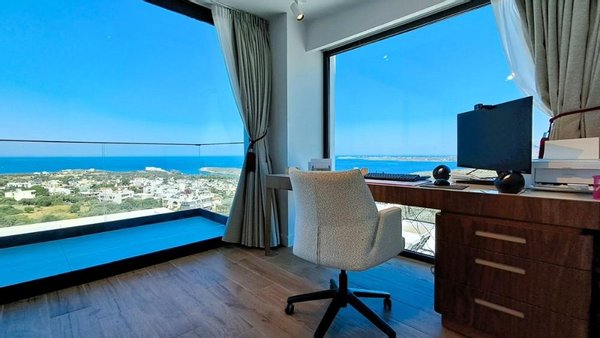 Obergeschoss: Zwei Schlafzimmer mit eigenem Bad und eigenem Balkon mit Blick auf Pool und Meer sowie ein zweiter Wohnbereich, ideal als ruhige Lounge oder zum Lesen.