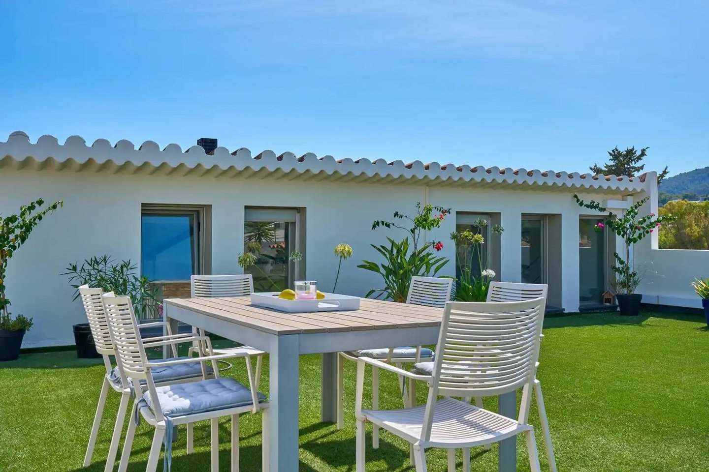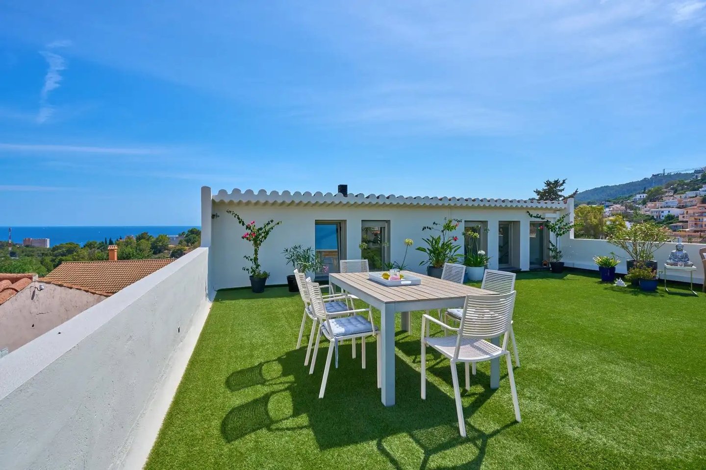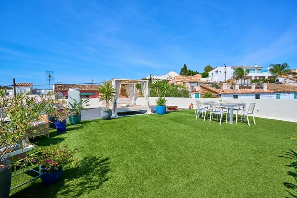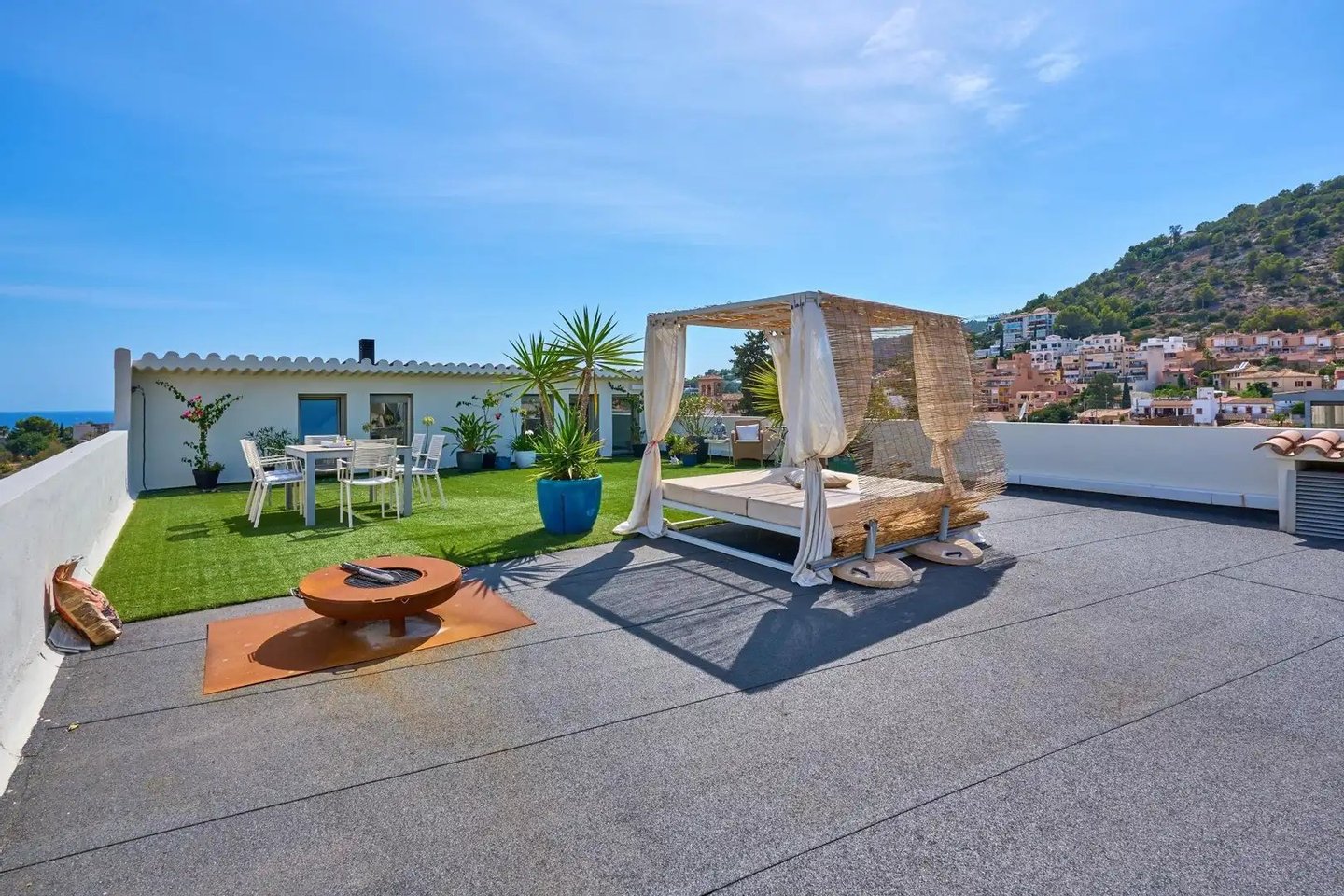 Im Obergeschoss bietet eine großzügige Terrasse von 133 m² einen Panoramablick auf die Hügel von Na Burguesa und das Meer in Porto Pi. Dank der strukturellen Festigkeit des Gebäudes besteht die Möglichkeit, einen Dachpool zu installieren, was das Außenerlebnis weiter aufwerten würde.