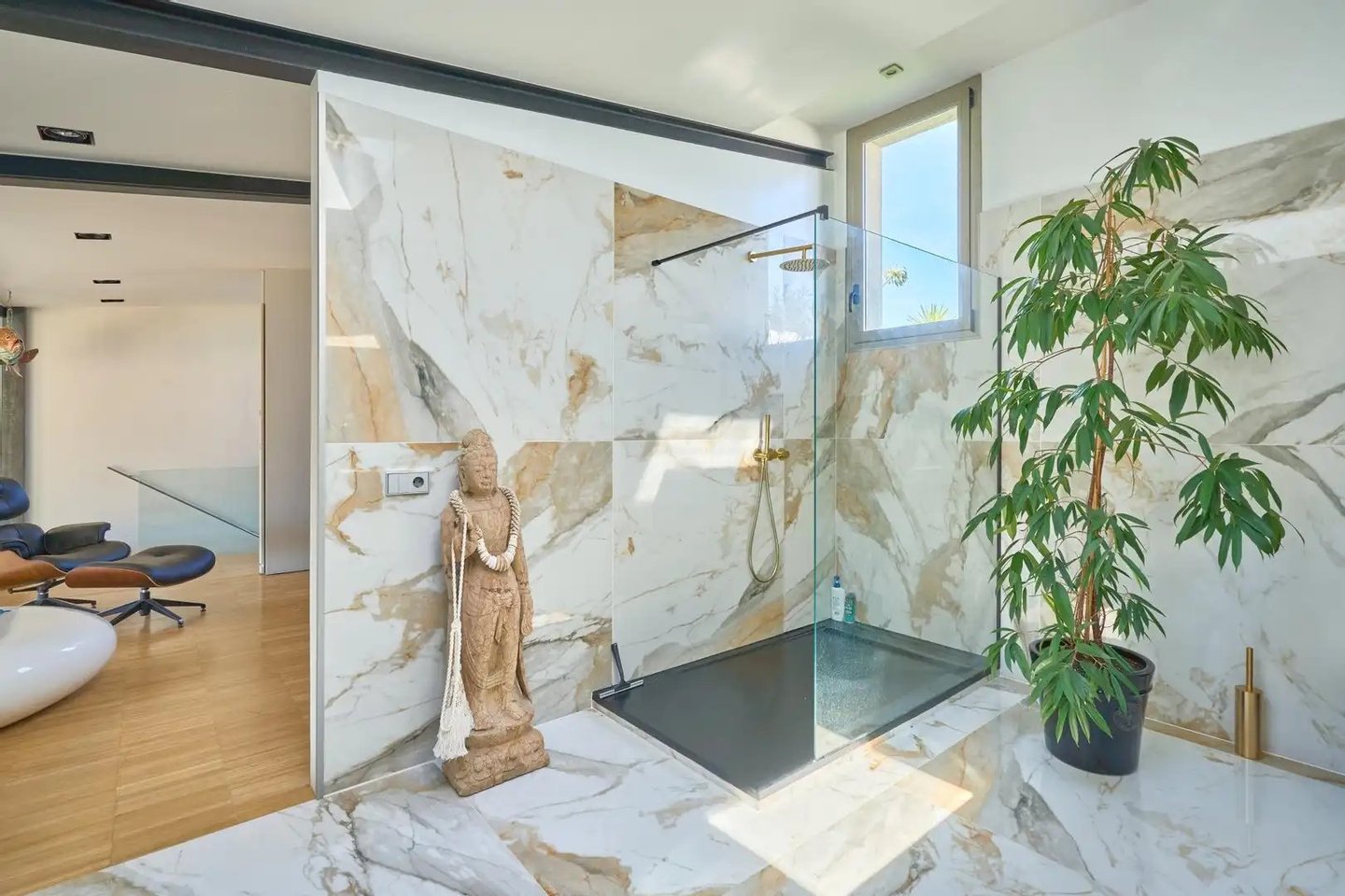 Eine verglaste Treppe führt zum Nachtbereich, wo Sie das Hauptschlafzimmer mit direktem Meerblick und ein kürzlich renoviertes en-suite-Bad finden, das aus Marmor verkleidet und mit hochwertigen Wasserhähnen ausgestattet ist.