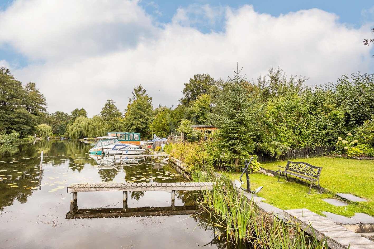 Draußen zeigt sich die Villa von ihrer schönsten Seite. Der gepflegte Garten mit seinen ca. 603 m² präsentiert eine ca. 16 m breite Wasserfront, die mit einer begehrten Steganlage ausgestattet ist. Hier können Bootsfreunde ihr Boot befestigen oder direkt über die eigene Slipanlage ins Wasser gleiten lassen. Abschließend wäre noch zu erwähnen, dass eine ca. 32 m lange Zufahrt zum Grundstück führt und einen Carport sowie einen weiteren Stellplatz für einen Pkw bereithält. Ein charmantes Gartenhaus bietet zudem Platz für Dies und Das.