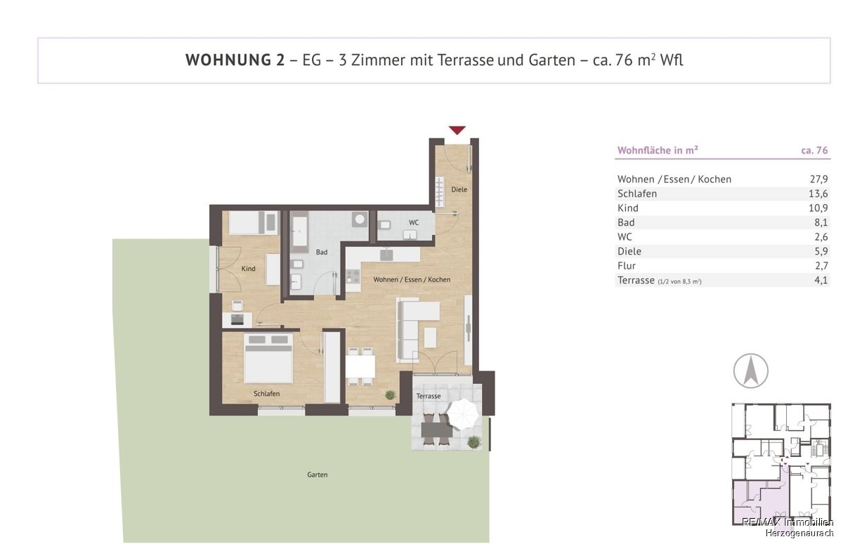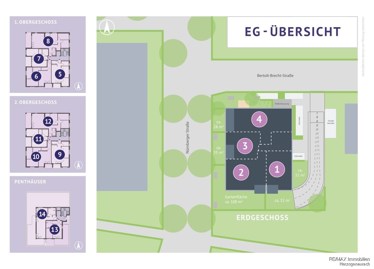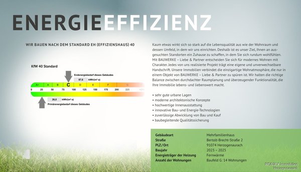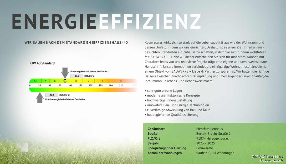 In Herzogenaurach entstehen 14 moderne 2- bis 4-Zimmer-Wohnungen zwischen ca. 53 m² und 101 m². Ob als Single, als Paar oder kleine Familie - die Wohnungen bieten für jeden Geschmack die richtige Wohnlösung. Modernste Ausstattung, Holzböden, Fußbodenheizung und viele weitere Ausstattungsdetails schaffen ein angenehmes Wohnambiente.