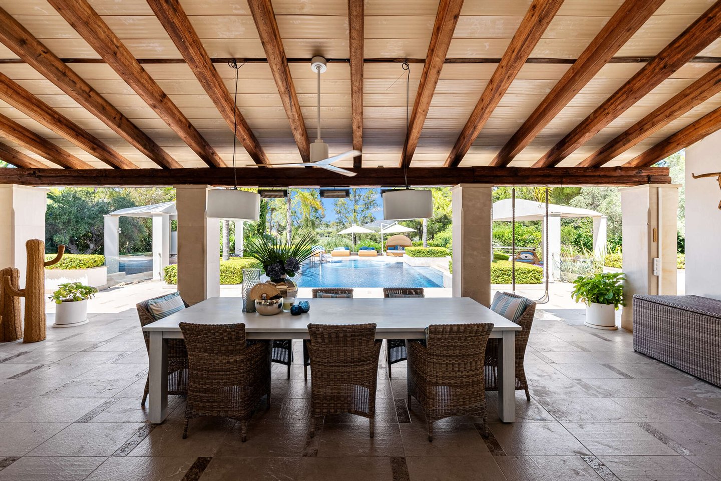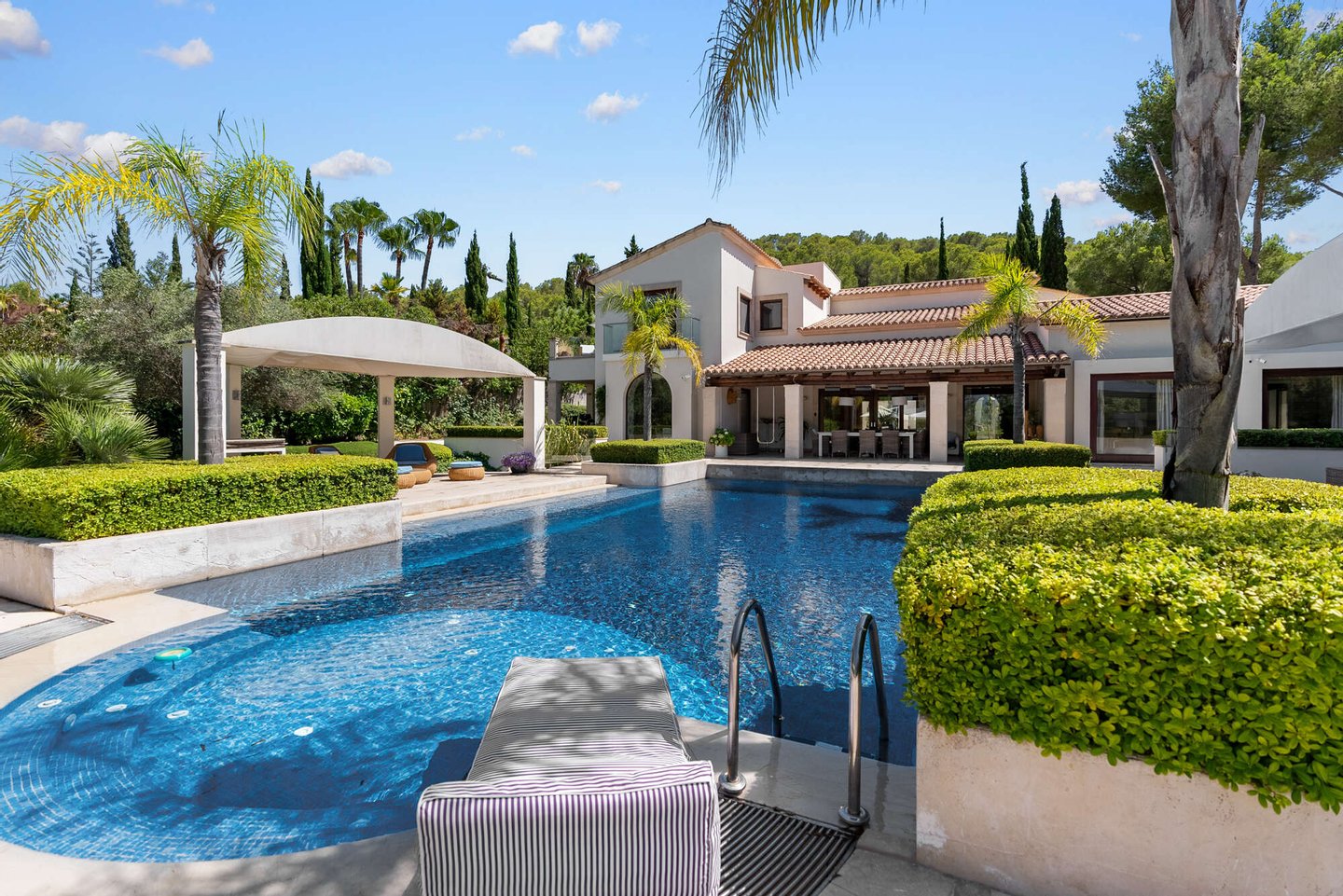 Die beeindruckende Poolanlage, umgeben von weitläufigen Terrassen und gepflegten Gartenflächen, bildet das Herzstück des Außenbereichs. Eine großzügige Garage rundet das Gesamtkonzept dieses Anwesens ab und unterstreicht den durchdachten Charakter der Immobilie.