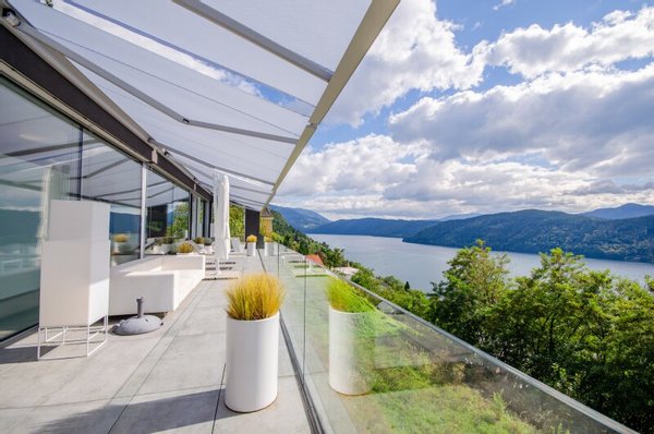 Die Hauptterrasse beim Wohnbereich ist mit elektrischen Markisen ausgestattet – perfekt, um sonnige Tage oder laue Abende in stilvollem Ambiente zu genießen.
