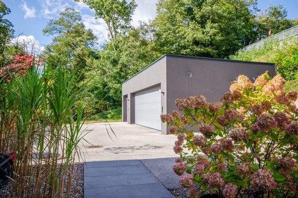 Das Anwesen umfasst zwei voll als Bauland gewidmete Grundstücke – ein Zubau ist also problemlos möglich. Das moderne Nebengebäude beherbergt eine großzügige Garage für drei Autos sowie eine weitere Einzelgarage, die auch als Abstellraum genutzt werden kann.