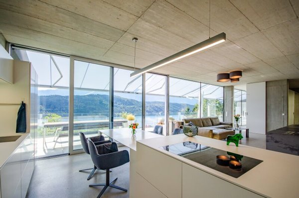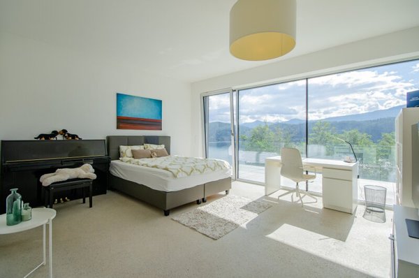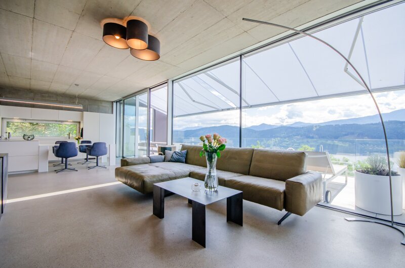 Alle Räume sind nach Süden ausgerichtet, mit raumhohen Fensterfronten und direktem Zugang zu weitläufigen Terrassen. Hier verschmilzt Innen und Außen – der Blick schweift über das funkelnde Blau des Sees, die sanften Hügel und die majestätische Bergkulisse Kärntens.