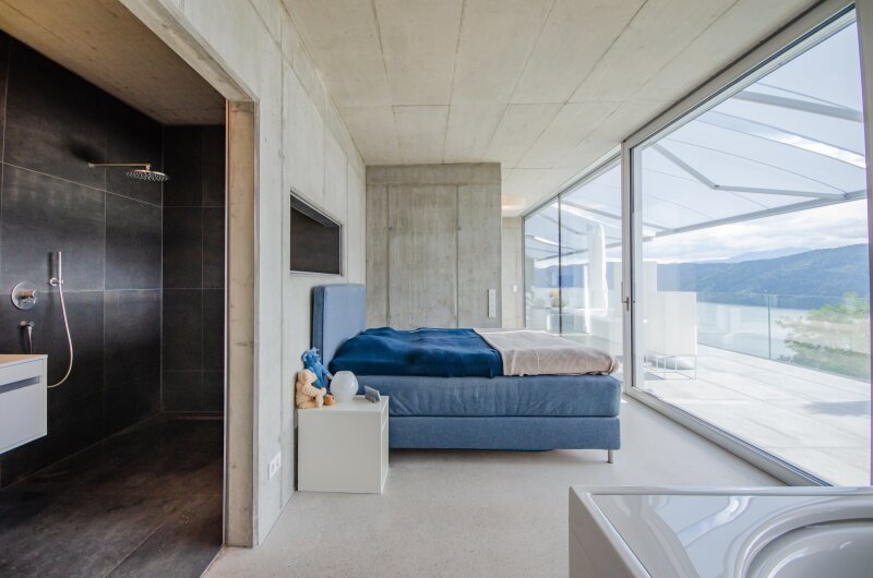 Erbaut im Jahr 2017, präsentiert sich das Haus als Meisterwerk moderner Architektur – puristisch, kraftvoll und dennoch warm. Sichtbeton prägt Wände, Decken und Böden, während großzügige Glasflächen den Innenraum mit Licht durchfluten und die spektakuläre Aussicht zum ständigen Begleiter machen.