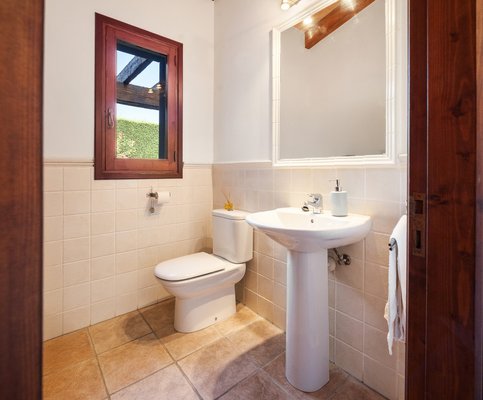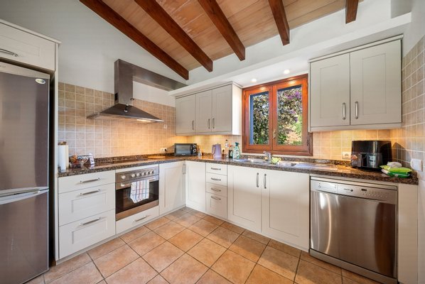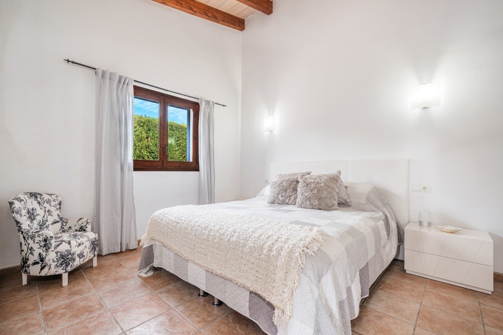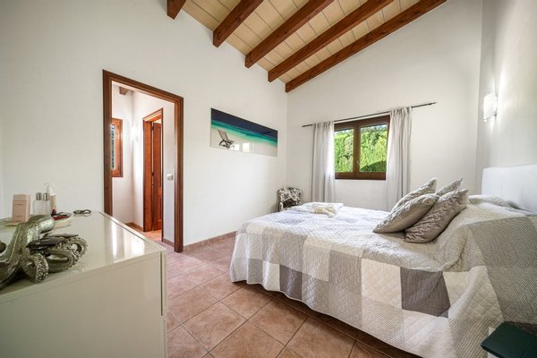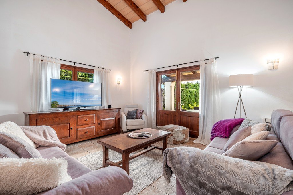 Das Haus verfügt über drei großzügige Schlafzimmer mit eigenem Bad, ein Gäste-WC und eine Klimaanlage im gesamten Haus. Hohe Decken mit sichtbaren Holzbalken verleihen Wärme und Charakter, während die Wohnräume hell und gut geschnitten sind. Ein Kamin sorgt für Gemütlichkeit und macht das Haus zu einem einladenden Zuhause zu jeder Jahreszeit.