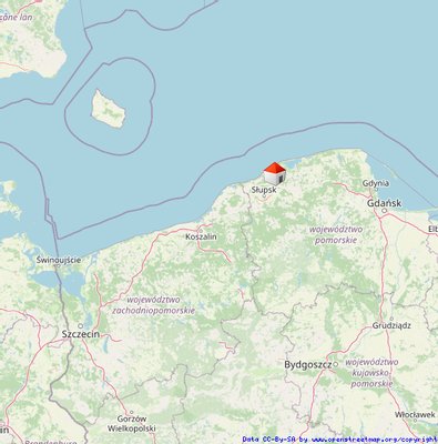Das Dorf liegt in Hinterpommern am nordöstlichen Fuße des Hügels Rowokól (Revekol) und befindet sich unmittelbar an der südlichen Grenze des Slowinzischen Nationalparks. Die Entfernung nach Slupsk (Stolp) beträgt ca. 28 km, nach Ustka (Stolpmünde)