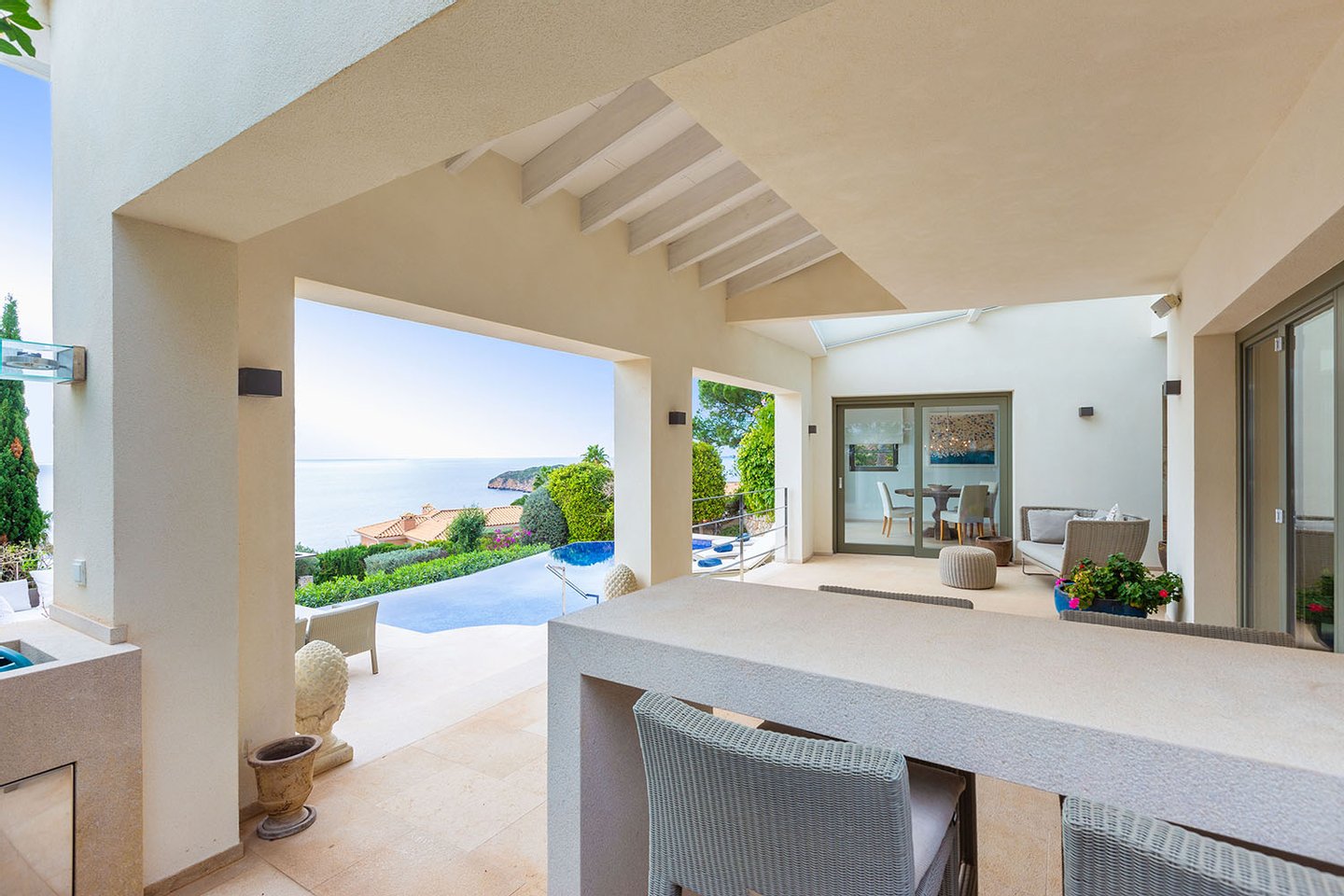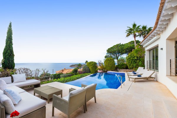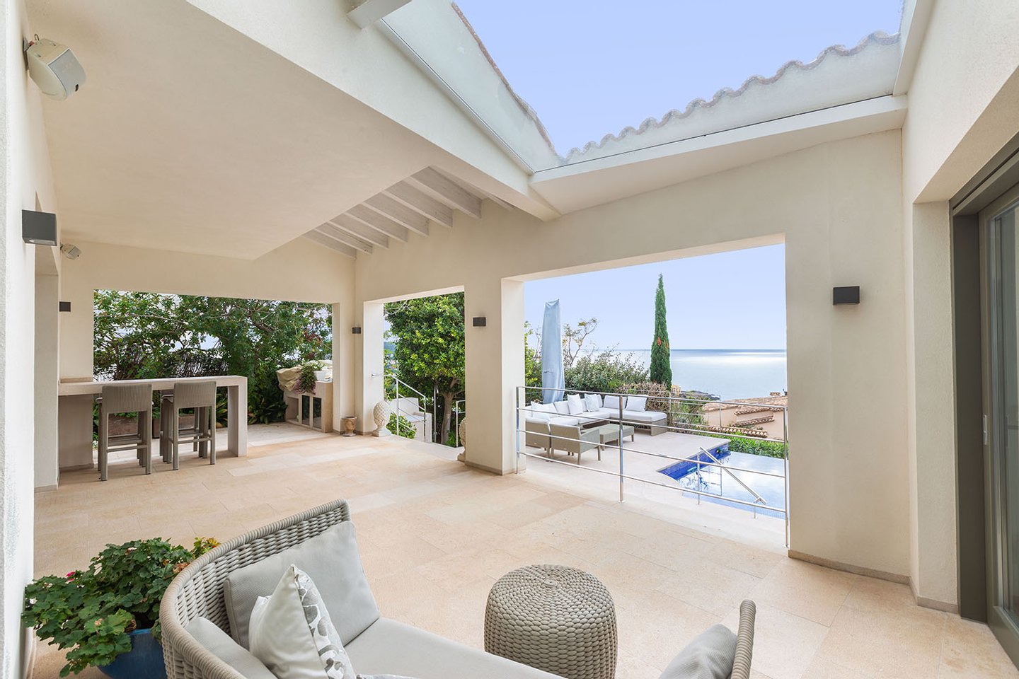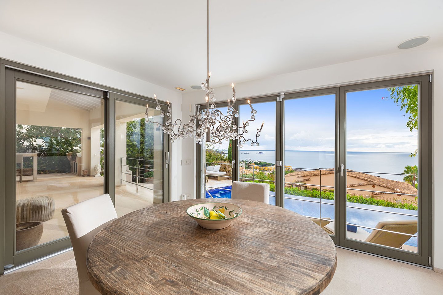Die Hanglage der Villa ermöglicht einen unvergleichlichen Panoramablick auf das weite Meer und die Malgrats-Inseln, sowie absolute Privatsphäre. Der Hauptwohnbereich im Erdgeschoss öffnet sich zu einer einladenden überdachten Terrasse mit Barbecue und dem herrlichen Pool-Bereich, der umgeben ist von einem terrassiert angelegten Garten im mediterranen Stil.