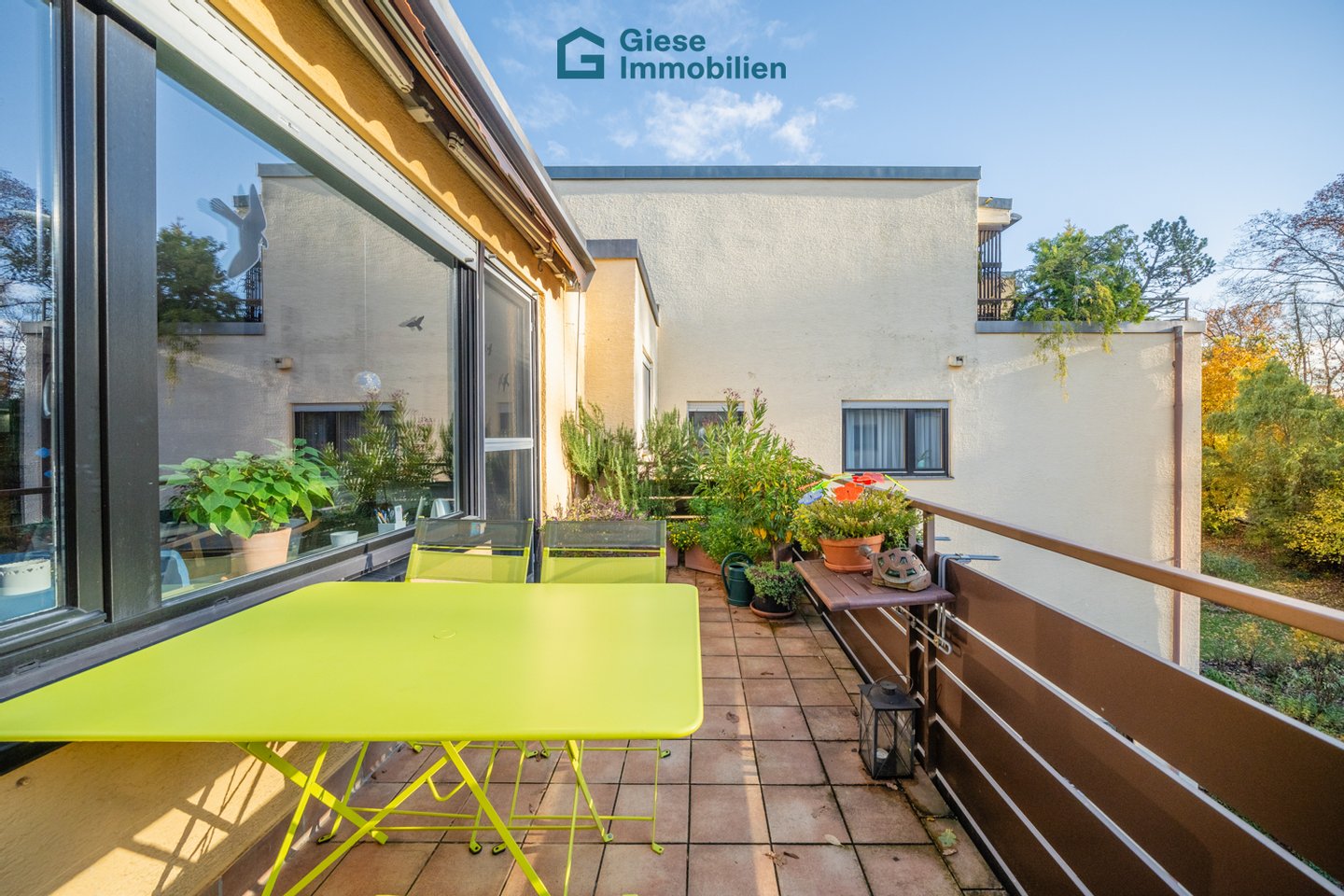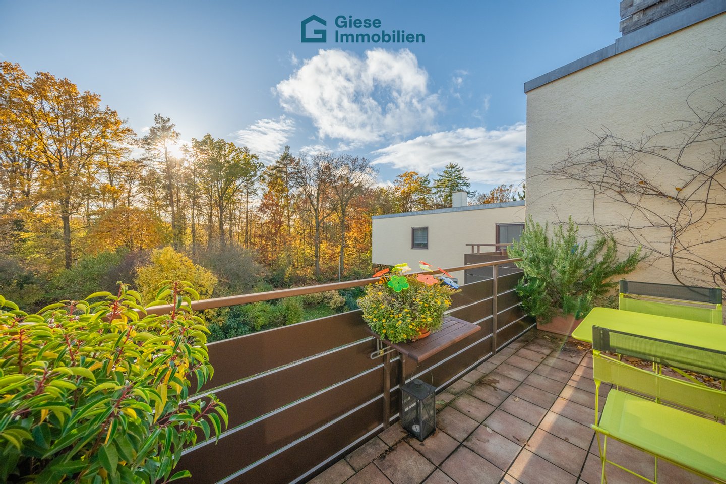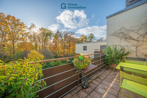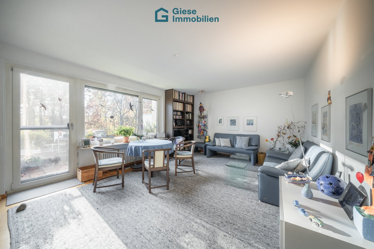Das großzügige Wohn- und Esszimmer überzeugt mit einer breiten Fensterfront, massivem Parkettboden und dem direkten Zugang zum sonnigen Balkon in Südwestlage. Von hier aus genießen Sie den Blick in die Baumwipfel und die ruhige Umgebung.