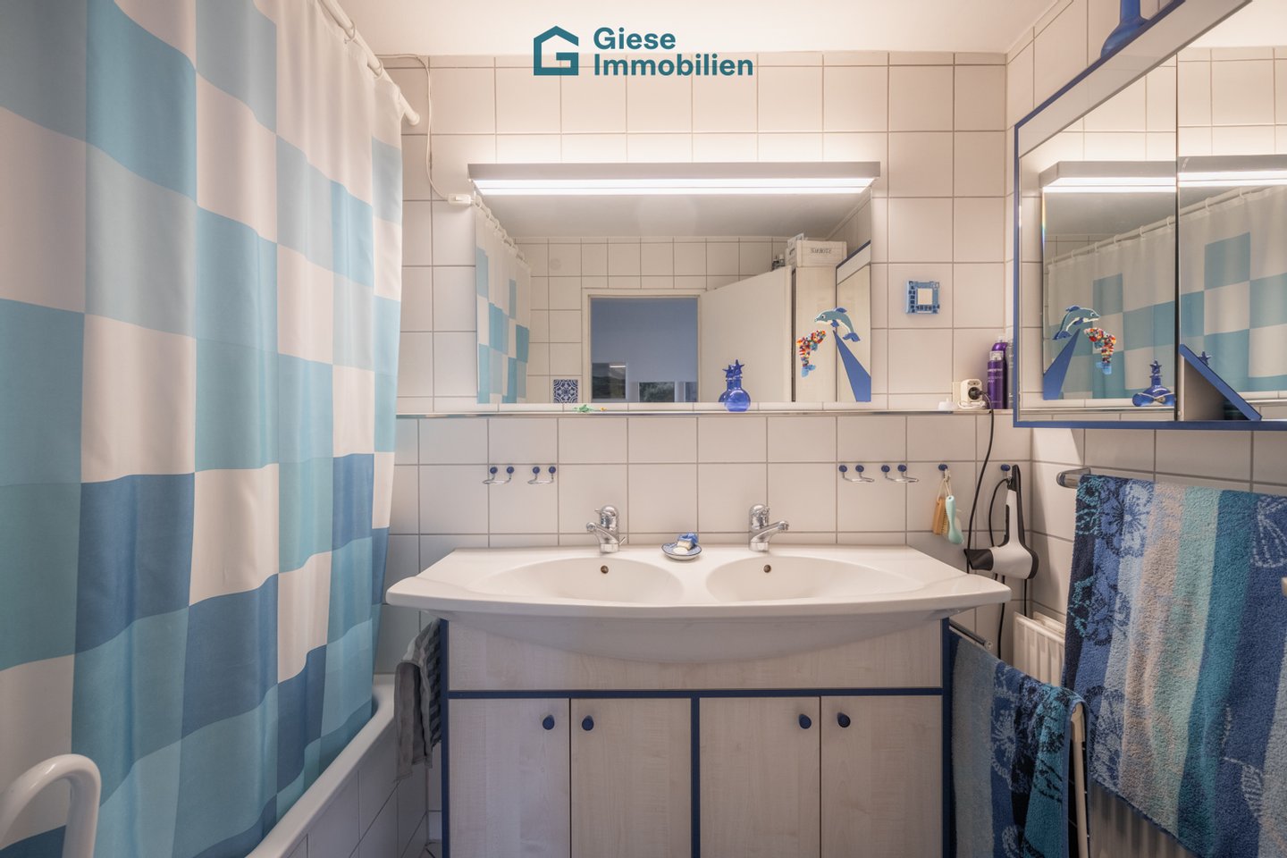 Das Badezimmer verfügt über eine Badewanne und einen Doppelwaschtisch. Das WC ist separat angelegt.