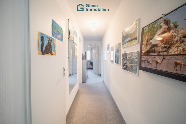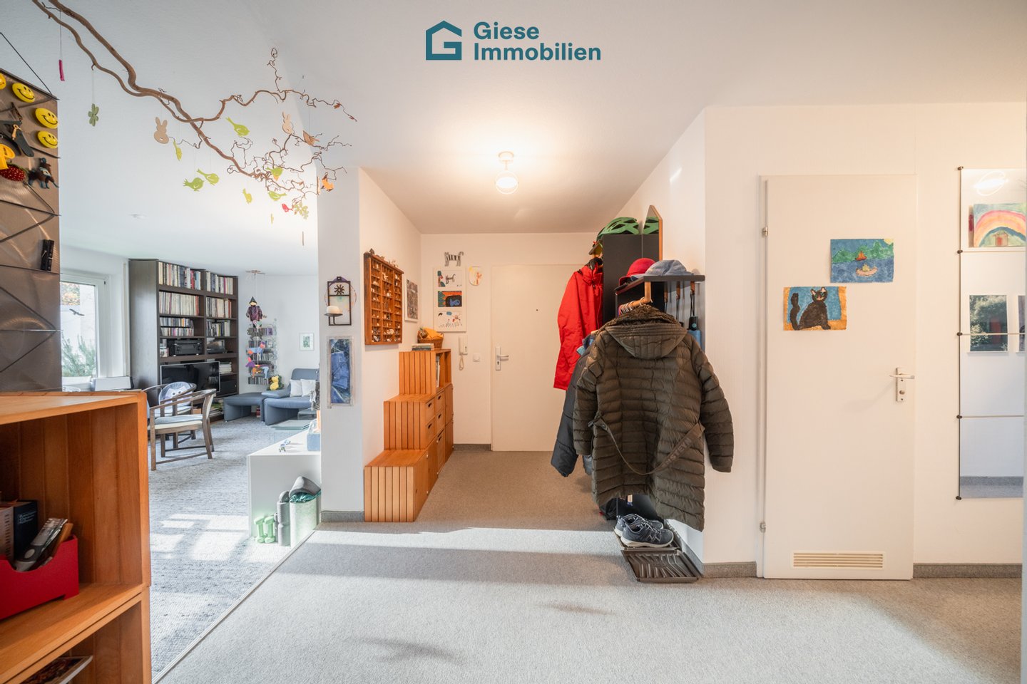 Vom Eingangsbereich aus öffnet sich der T-förmige, geräumige Flur, von dem aus alle Räume erreichbar sind. Direkt am Eingang befindet sich viel Platz für eine Garderobe. Vor der Küche gibt es eine gemütliche Nische mit Raum für einen Frühstücksplatz – ideal für den schnellen Kaffee am Morgen.