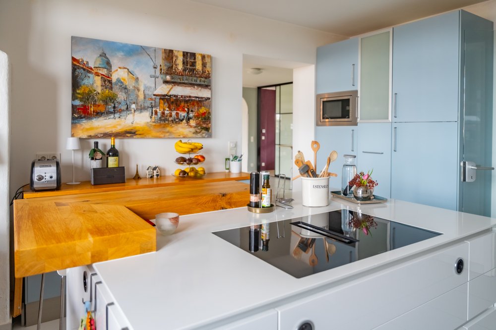 Die Wohnung verfügt über eine offene Küche mit moderner Einbauküche, ein angrenzendes Esszimmer, ein Gäste-WC mit Dusche, ein Arbeitszimmer sowie ein Schlafzimmer. Arbeits- und Schlafbereich sind jeweils durch japanische Glastrennwände optisch abgeteilt. Das großzügige Hauptbad ist direkt über das Schlafzimmer zugänglich. Der große Balkon ist überdacht und lädt ein, viel Zeit im Freien zu verbringen.