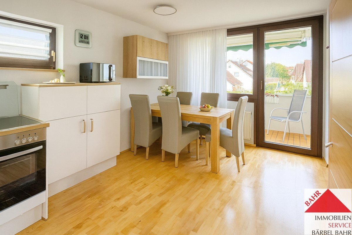 Aus dem Wohnzimmer / Esszimmer gelangen Sie auf den schönen überdachten West-Balkon. Ob ein entspanntes Mittagessen im Schatten oder der Abend unter dem Sternenhimmel - dieser Platz lädt zum Genießen ein. Hier lassen sich gesellige Stunden mit Familie und Freunden verbringen.