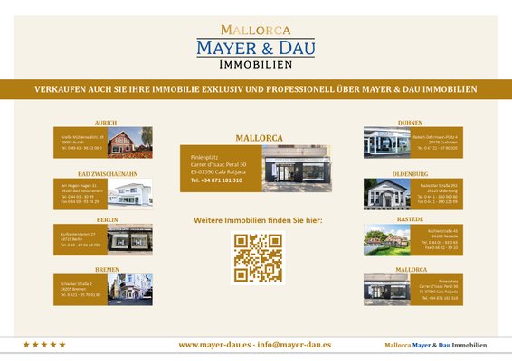 Das Projekt wird von einem bekannten und seriösen Bauunternehmer im Zentrum von Palma realisiert, der aufgrund seiner hochwertigen Bauausführung mit einer ansprechenden Architektur, einen ausgezeichneten Ruf genießt. Eine der drei beeindruckenden Penthouse-Wohnungen ist bereits verkauft, daher sollten Sie sich beeilen, um eine der verbleibenden Einheiten zu reservieren. Desweiteren kann ein Tiefgaragenstellplatz für den Kaufpreis von 49.900€ sowie einen Abstellraum für 9.000 € erworben werden.
