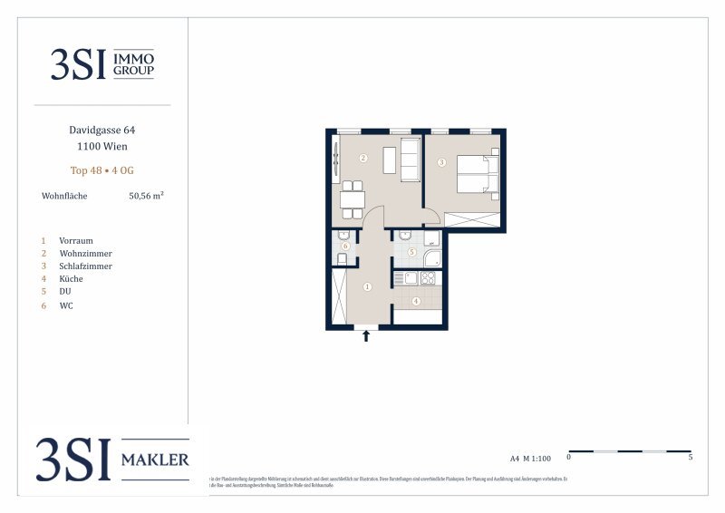 Vom Vorraum mit integrierter Küchenzeile gelangt man in das großzügige Wohnzimmer - ein Raum, der mit seinen hohen Fenstern und der idealen Südausrichtung jeden Tag in goldenes Tageslicht taucht. Das separate Schlafzimmer bietet einen ruhigen Rückzugsort, während das Bad mit Dusche und das separate WC praktischen Komfort gewährleisten.