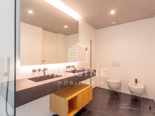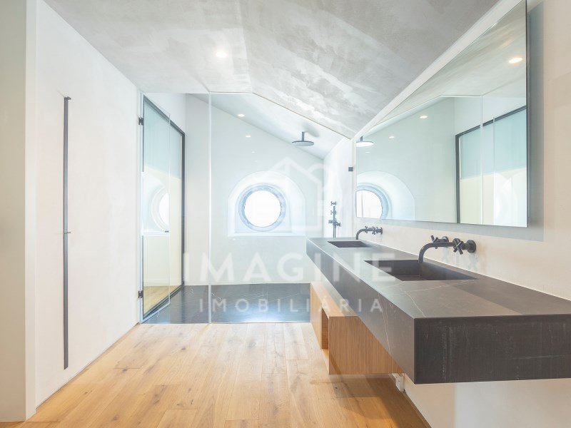 Dieses einzigartige Apartment verfügt über drei geräumige Suiten im Obergeschoss und zwei weitere Schlafzimmer im Erdgeschoss. Jede der Suiten verfügt über ein eigenes Bad mit raffinierten Oberflächen, hängendem Geschirr, ultrakompakten, bodenebenen Duschwannen und Antibeschlagspiegeln, die absoluten Komfort und Eleganz gewährleisten. Im Erdgeschoss befinden sich auch zwei Badezimmer, eines komplett und eines mit Service. Das Hauptbadezimmer auf dieser Etage hat den gleichen Detailgrad und die gleiche Qualität wie die anderen, während das diskretere Servicebad für zusätzliche Praktikabilität im Alltag sorgt.