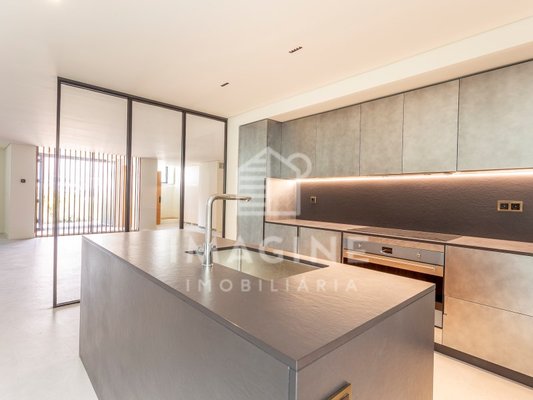 Der soziale Bereich im offenen Raum integriert ein großes Wohnzimmer mit großzügigen Flächen und eine voll ausgestattete Küche mit SMEG-Geräten, Speisekammer, Waschküche und Speisekammer, alles mit maximaler Effizienz und raffinierter Ästhetik.