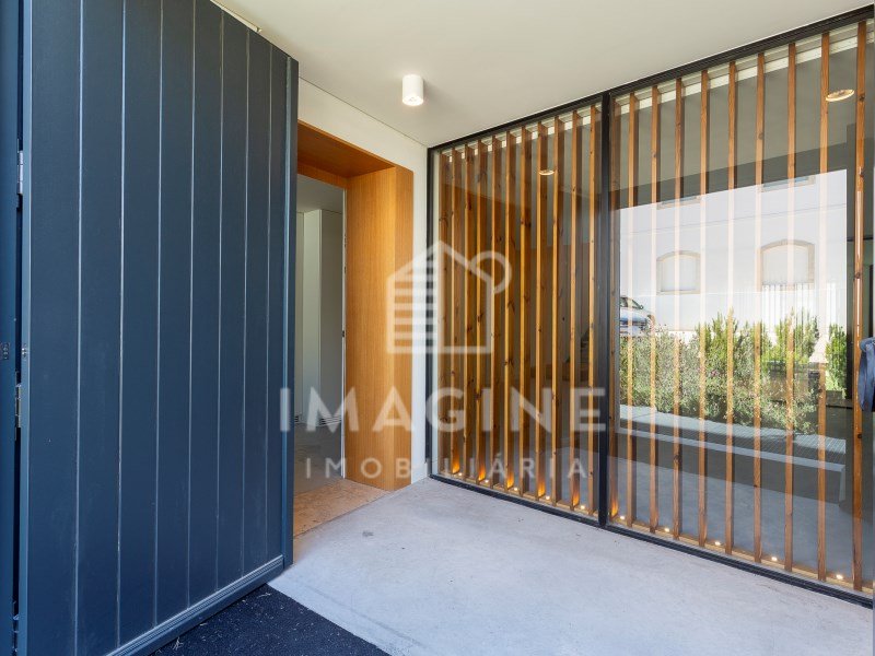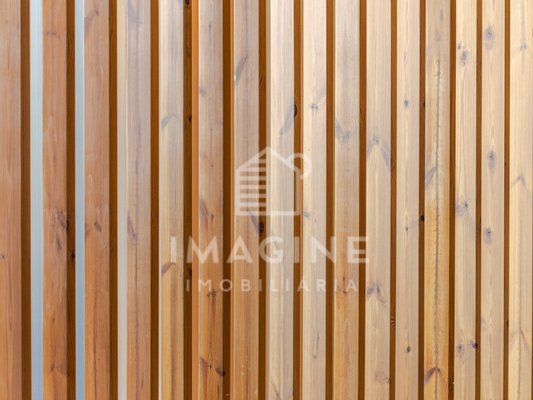 Der Eingang erfolgt durch einen eleganten Vorraum mit Aluminiumlamellen, der mit Holz beschichtet ist und einen subtilen Übergang zwischen der Straße und dem Wohnraum schafft.