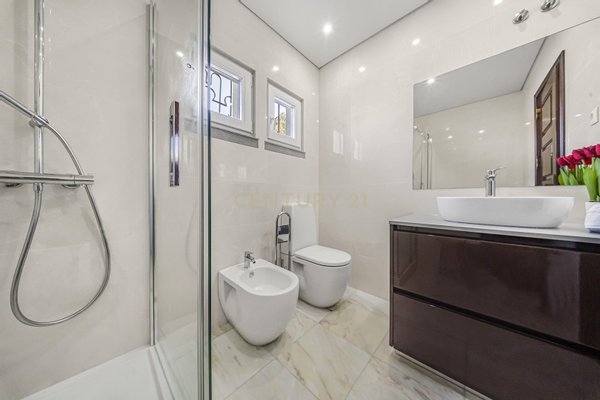 Im 1. Stock befinden sich 2 Schlafzimmer (mit 14,28 und 12,76 m2), mit einem kompletten Badezimmer, eine Suite mit 14,80 m2, ein Badezimmer mit 9,38 m2 und ein Ankleidezimmer, ein tolles Lesezimmer mit 14,06 m2. Alle Fußböden und die Treppe, die zu dieser Etage hinaufführt, sind aus massiver portugiesischer Steineiche gefertigt, eine edle Wahl, die der Umgebung Wärme und Schönheit verleiht.