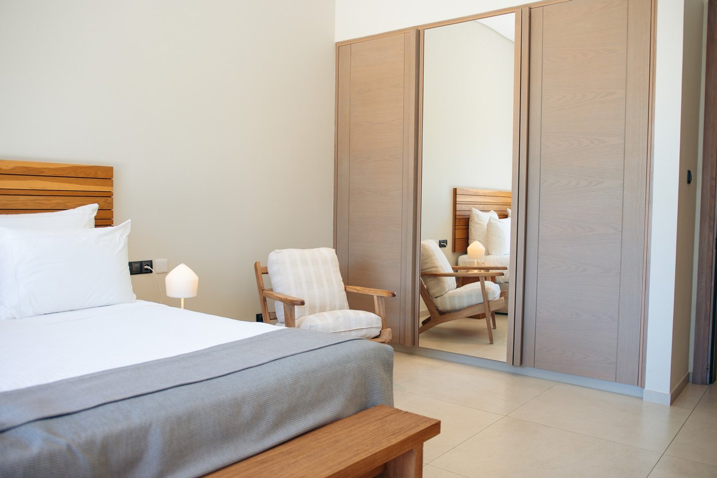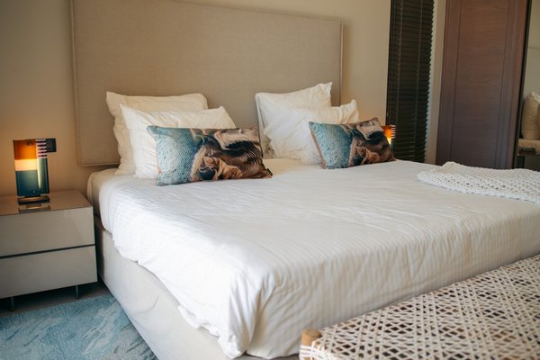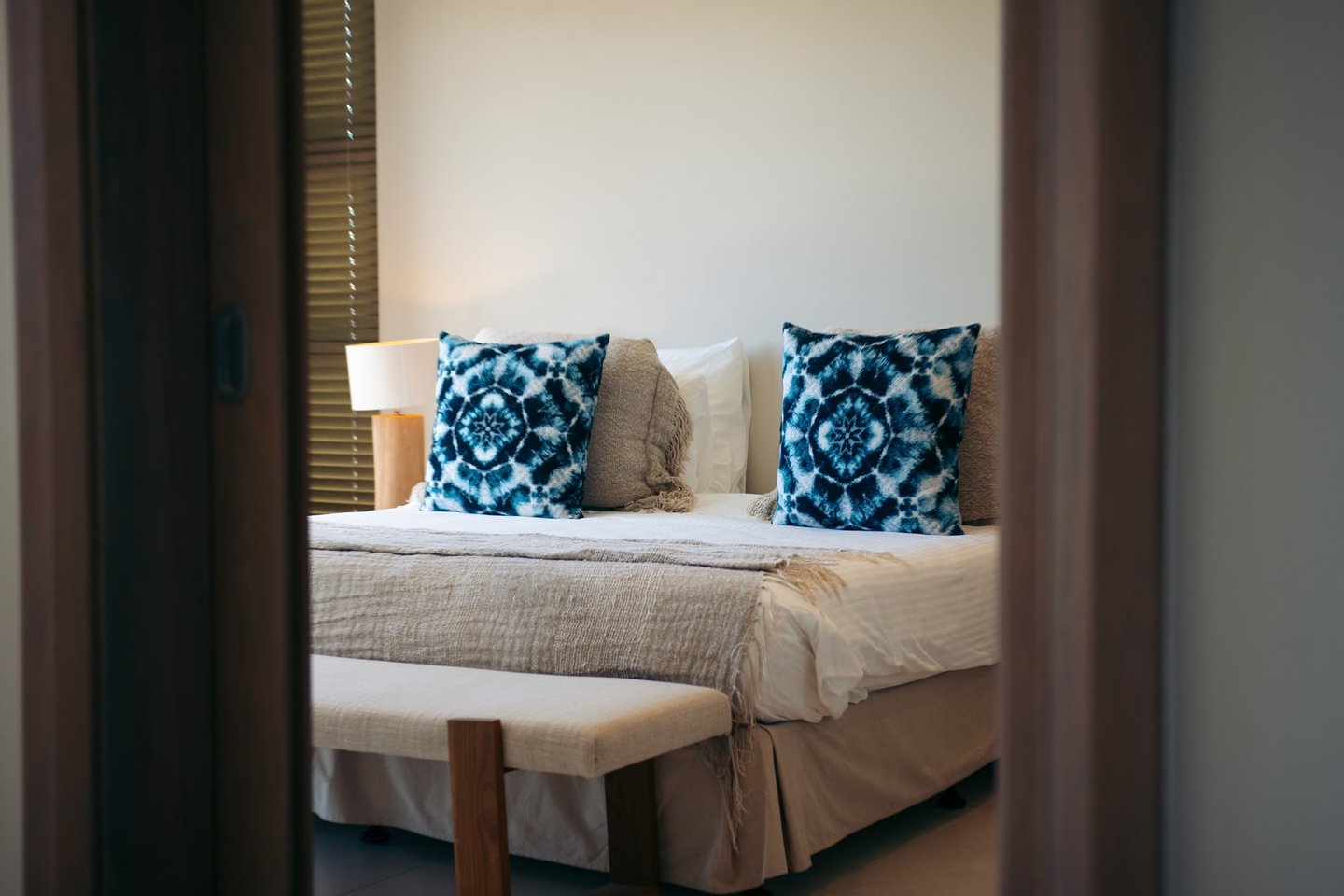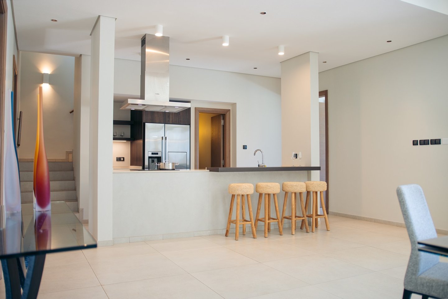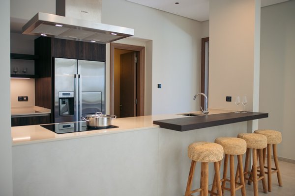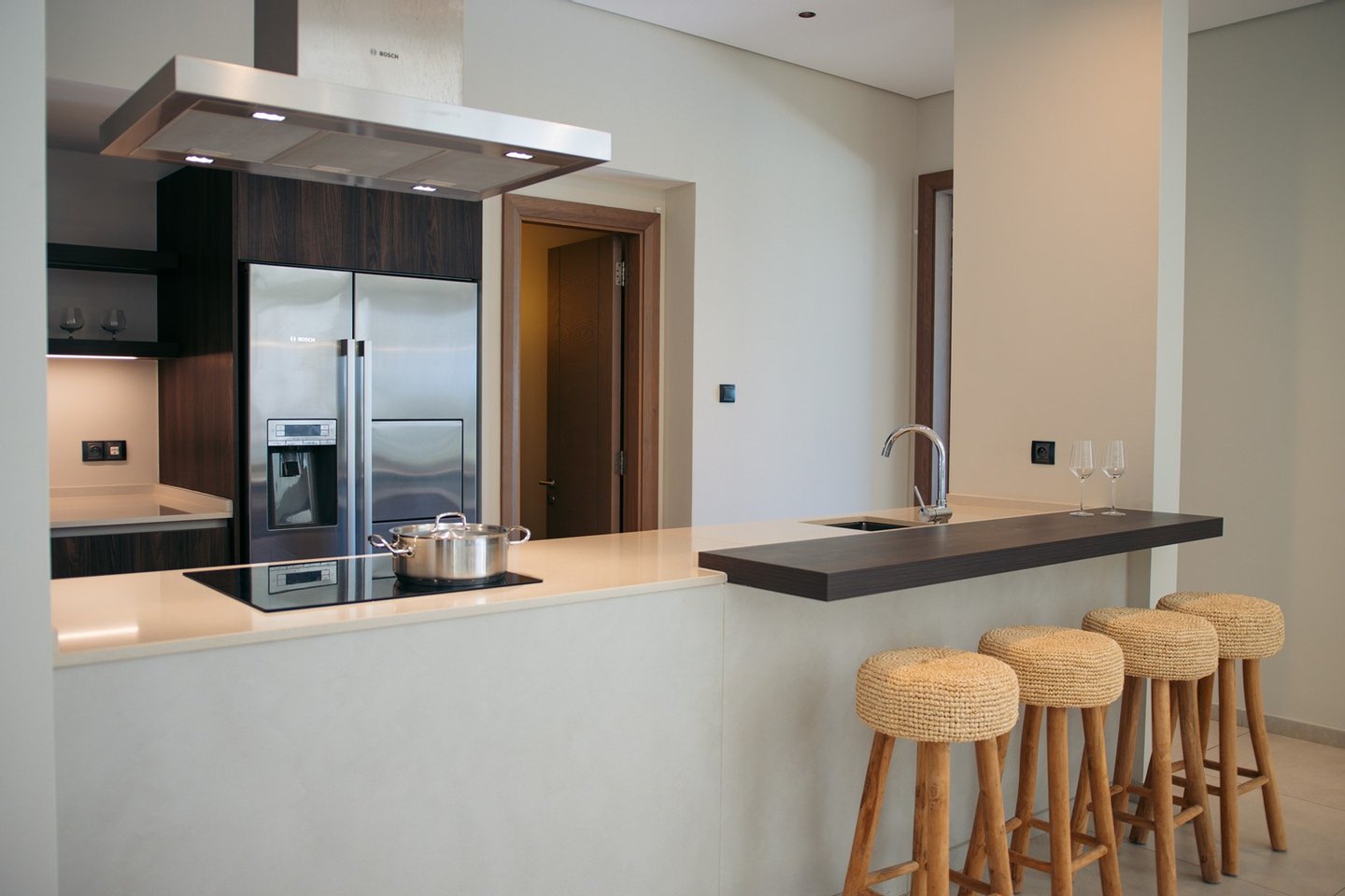 Im Inneren empfängt Sie ein offener Wohnbereich in sanften Sand- und Cremetönen, der Ruhe und Harmonie vermittelt. Die moderne offene Küche mit Frühstücksbar und hochwertigen Geräten wird durch eine zweite, vollständig ausgestattete Hinterküche ergänzt – ideal zum Vorbereiten von Fisch oder wenn Sie Gäste empfangen.