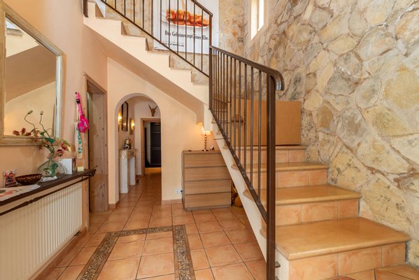 Das Haupthaus mit ca. 155 m² Wohnfläche erstreckt sich über zwei Etagen und besticht durch traditionelle Architektur mit Steinfassade und einer eindrucksvollen Deckenhöhe von ca. 8 m im Eingangsbereich. Diese charakteristischen Elemente bilden die perfekte Grundlage für eine stilvolle Modernisierung im mediterran-modernen Stil.