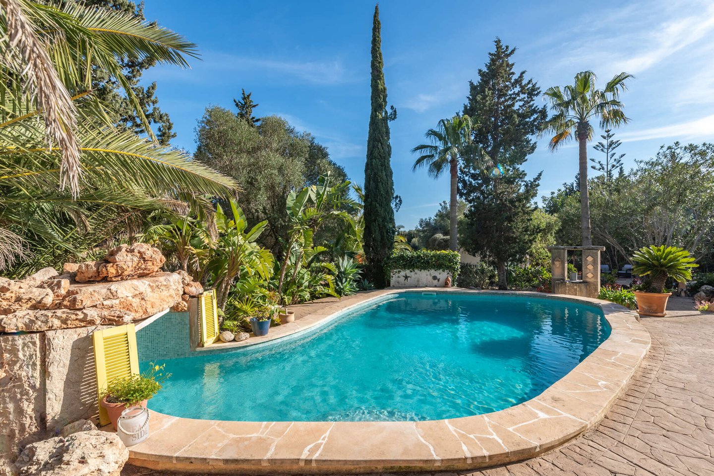 Der weitläufige Garten mit beeindruckendem Pool (ca. 43 m²), romantischem Wasserfall und mehreren Sitzecken schafft ein unvergleichliches mediterranes Ambiente.