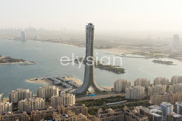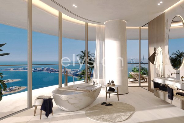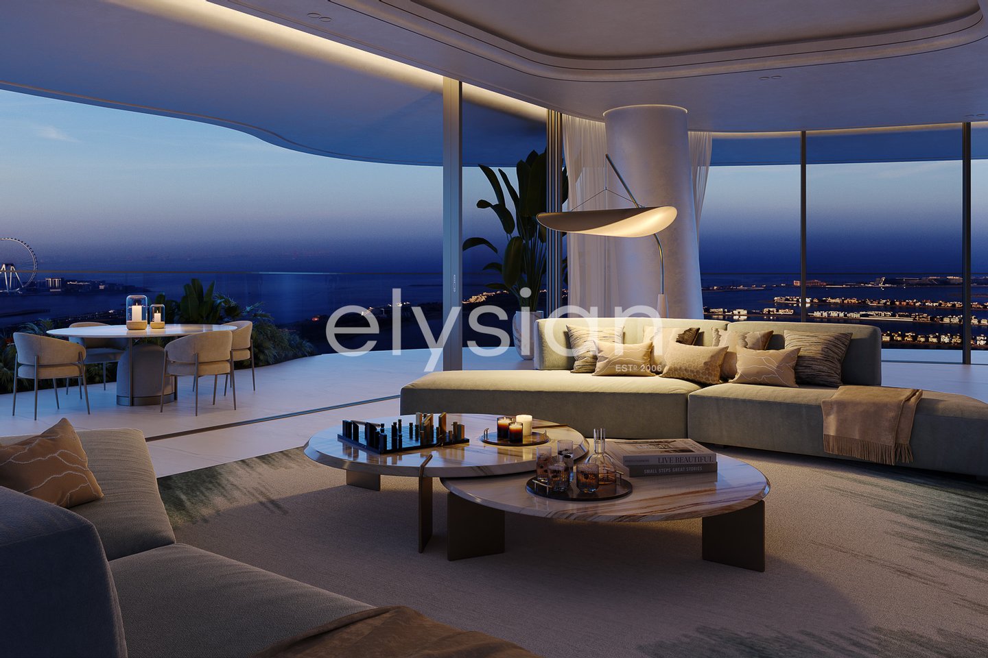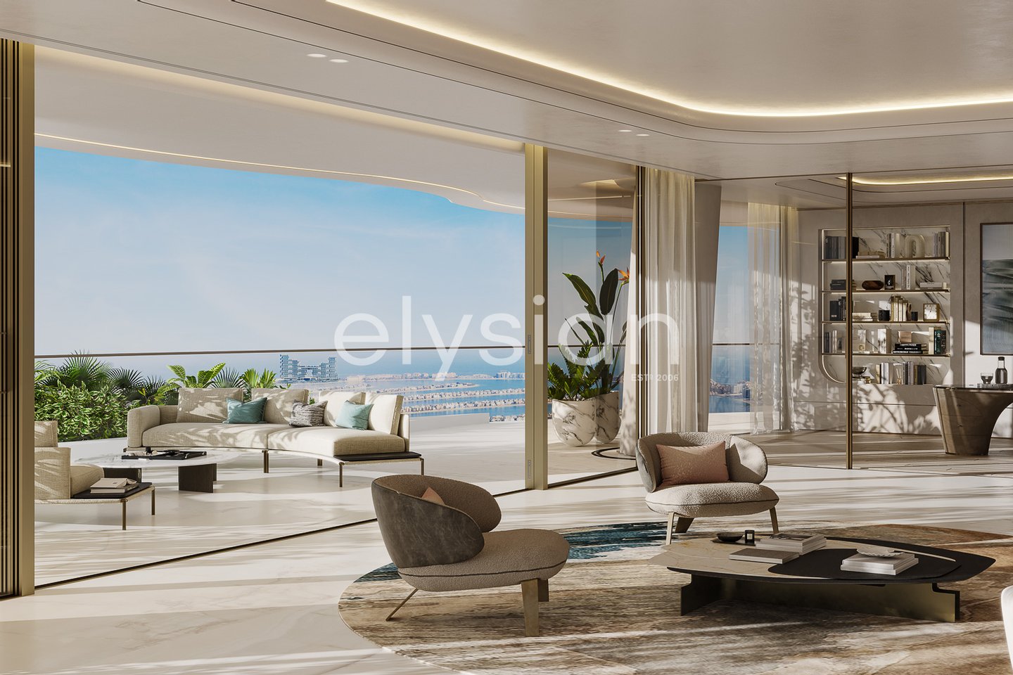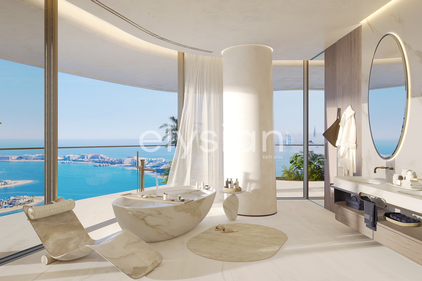 Dieses 9.837 Quadratfuß große Wohnhaus bietet eine sorgfältig gestaltete Grundrissanlage mit einem großzügigen Wohnbereich, einer hochmodernen Küche und vier elegant gestalteten Schlafzimmern mit eigenem Bad. Der 2.643 Quadratfuß große Balkon bietet atemberaubende Ausblicke auf die Skyline der Dubai Marina, Palm Jumeirah und den Arabischen Golf.