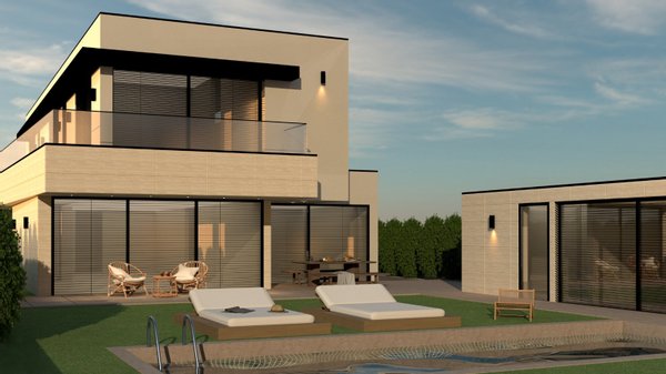 Eine 4-Zimmer-Villa im Bau mit Swimmingpool und Meerblick, auf einem großen Grundstück von 675 m², mit moderner, detailreicher Architektur und hochwertigen Oberflächen und Materialien.